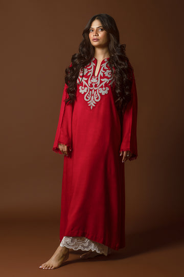 A crisp ivory canvas dotted with hand-embroidered red hearts—this longline shirt set is an ode...