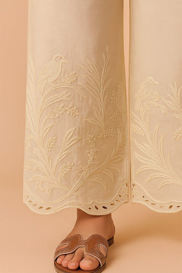 Introducing our exquisite Three-Piece Suit with Embroidery on the Neckline, paired with a Block Print...