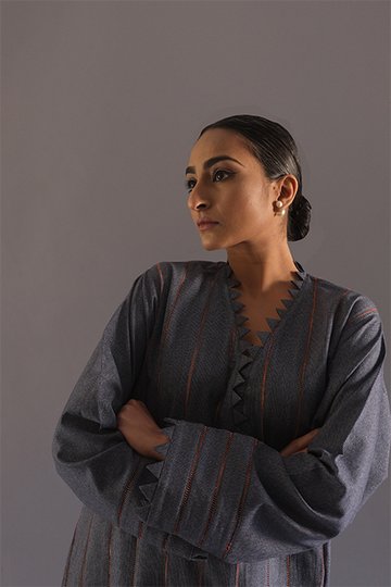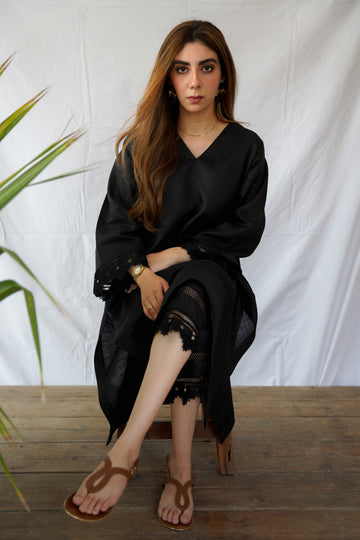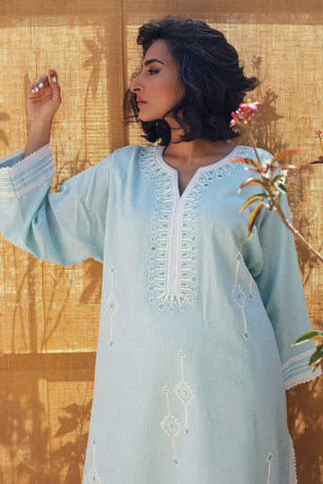 Soraya is a Relaxed-cut linen Kurta with Dori embroidery finished with lace detailing.
