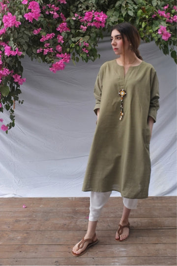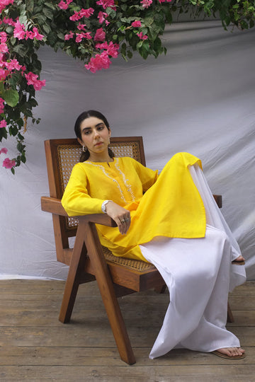 Gul is a Relaxed-cut linen Kurta with Dori embroidery finished with lace detailing.