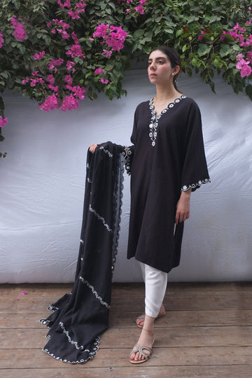 Nouri is a linen co-ord set that features black dori embroidery and is finished with...