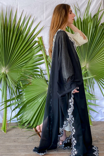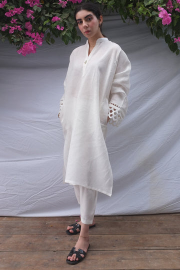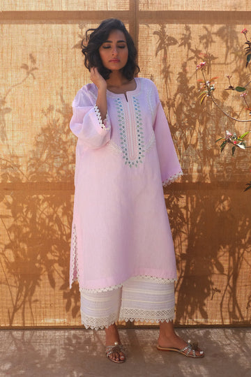 Ziba is a relaxed cut kurta with dori and mirror embroidery finished with lace detailing.