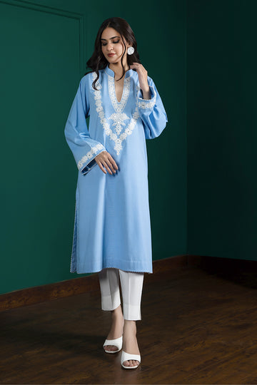 Shrnaz is a relaxed-cut sky blue Kurta, featuring one-toned Dori and mirrored embroidery. The model...