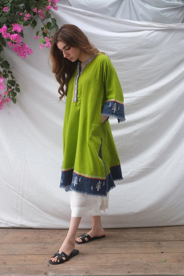 Taban is One-size Relaxed-cut Linen Kurta, fnished with organza trimming and kanta sticth.