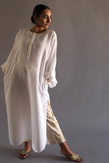 Diba, brings in elements of indigenous craftsmanship in a classic white relaxed-cut linen kurta with...