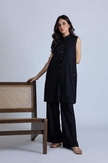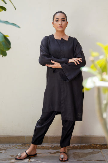 abnus is black linen co-ord set, with wooden button detailing on the front and sides...