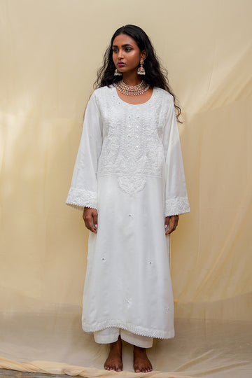 A pristine white kaftan featuring gold-tone dori embroidery that flows across the fabric like poetry....