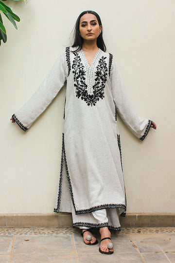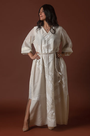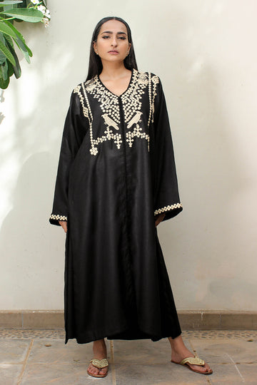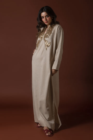A serene earth-toned kaftan in Irish linen, with organic, free-flowing dori embroidery that mimics natural...
