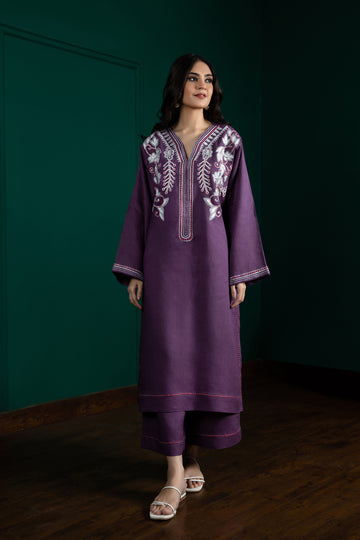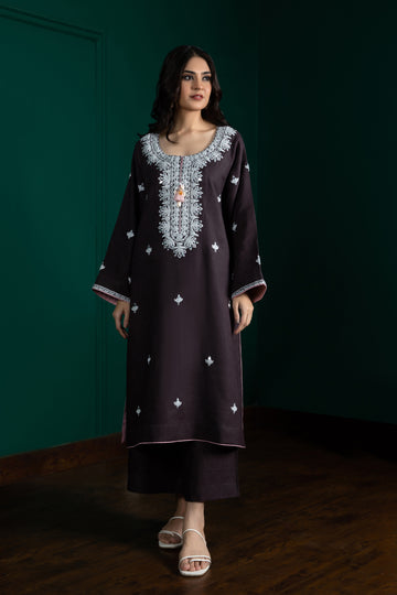 Dilara, Boho-chic, dark purple colored co-ord set is accentuated with multicolored zari embroidery, finished with...