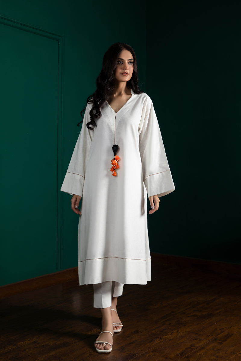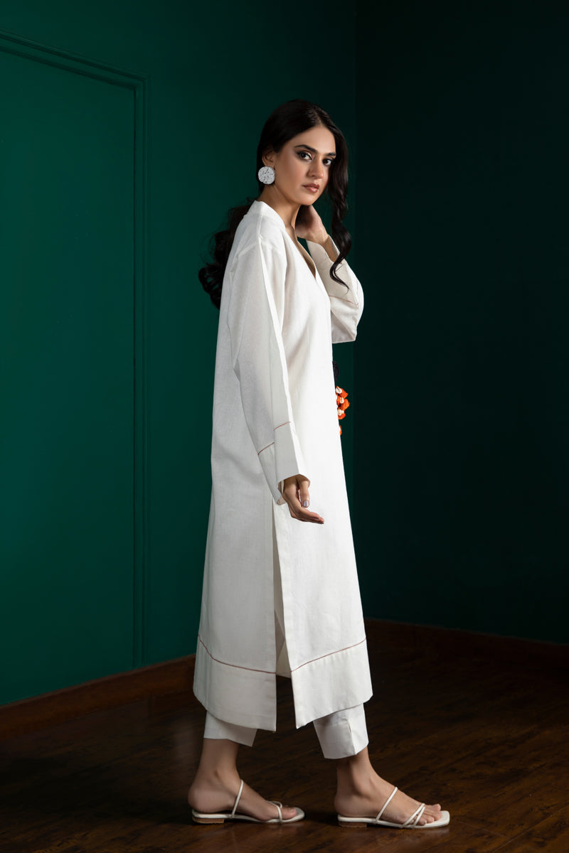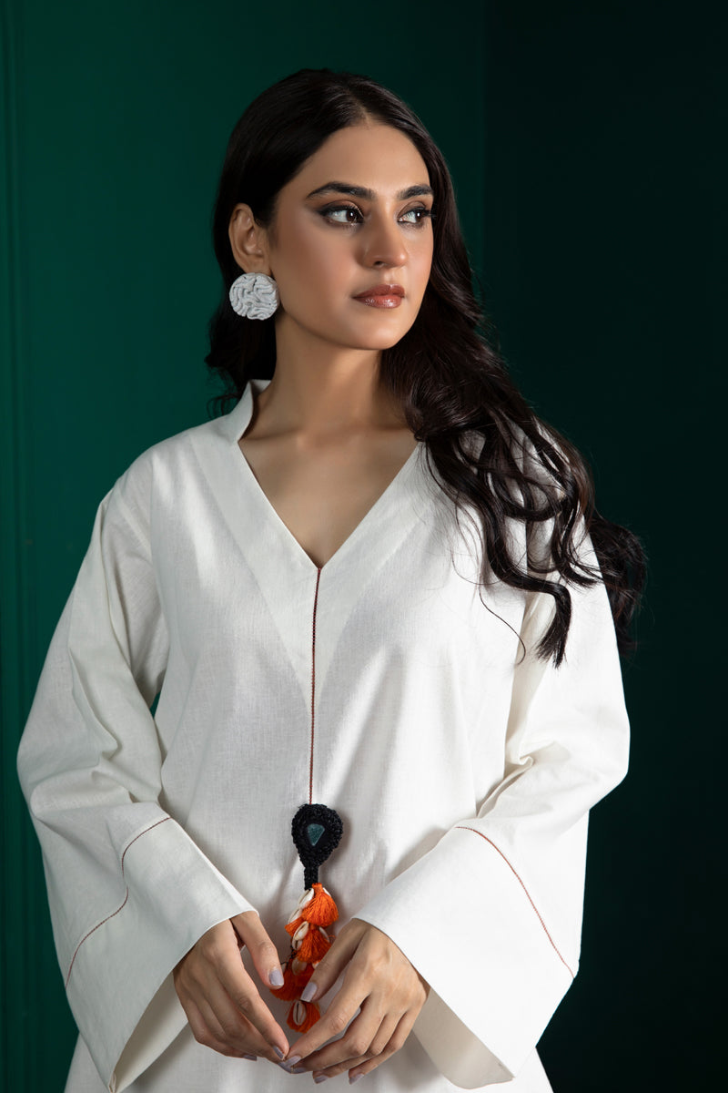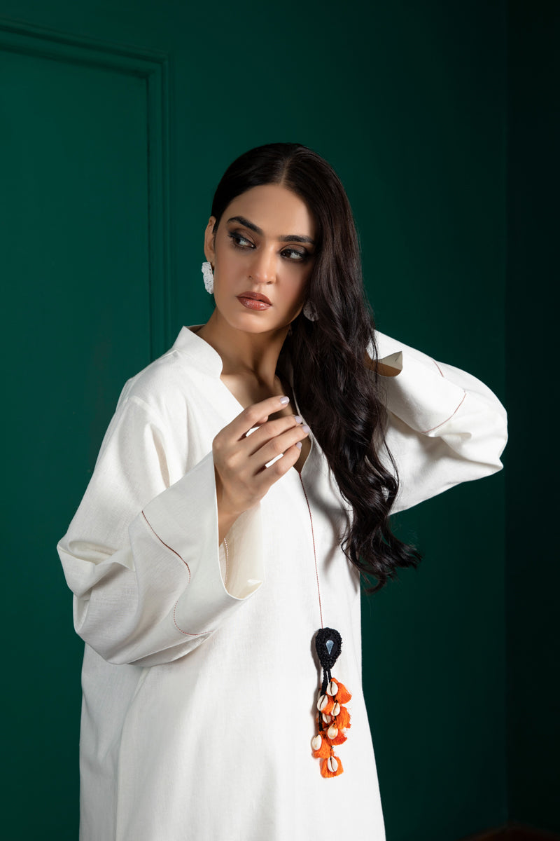 Asal is one size, relaxed-cut linen Kurta with Tarkashi detailing finished with a mirrored and sea shell Tassled Button.