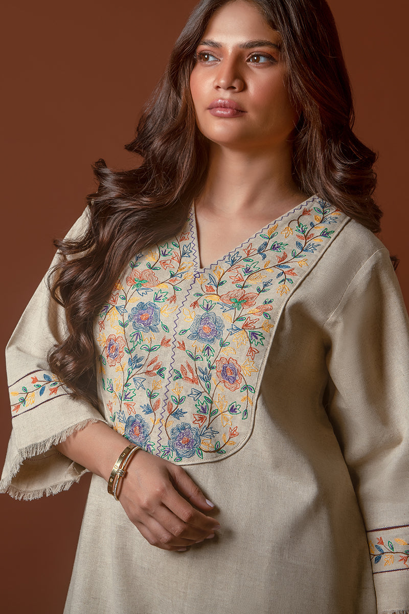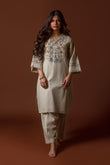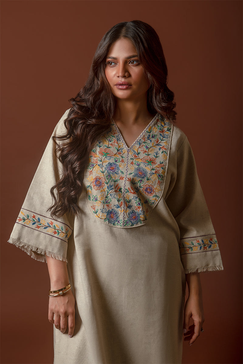 This ensemble features an intricately embroidered neckline with floral motifs that add a touch of charm and sophistication to its minimalist design. The embroidery, combined with the natural beige tone of the linen, creates a timeless aesthetic. The sleeves are adorned with delicate details, further enhancing the outfit's appeal. Paired with a sleek, tailored skinny shalwar, this outfit strikes the perfect balance between traditional and contemporary fashion. The slim fit of the shalwar gives a modern twist, making it versatile for casual wear or semi-formal occasions.