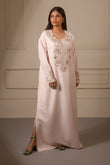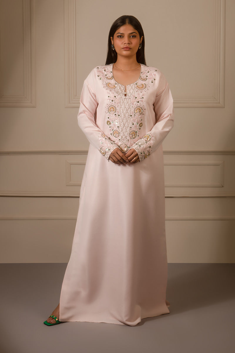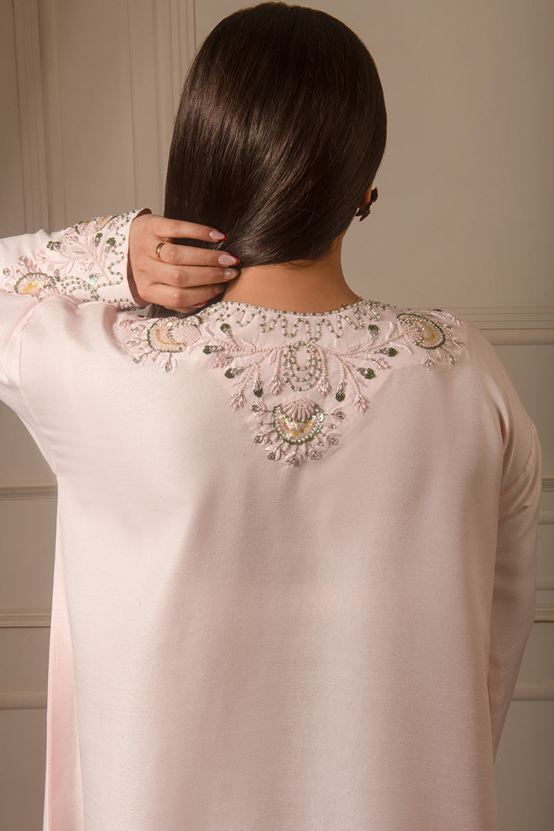 Inspired by the enchanting hues of dawn, CLEO AURORA is a statement kaftan crafted in delicate pink silk, adorned with shimmering pink and green sequins and intricate beadwork. The gradient embellishments create a soft ombré effect, cascading elegantly from the neckline to the hem, evoking the first light of morning. With its relaxed yet refined silhouette, this piece embodies effortless glamour—where sophistication meets celestial radiance.