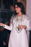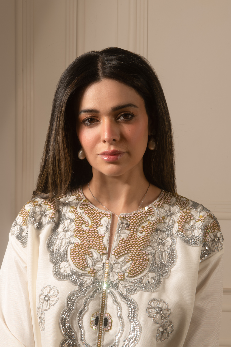 A vision of radiant elegance, CLEO LUMINÈRE is a silk kaftan that shimmers with hand-embellished crystals and sequins. Inspired by the golden glow of candlelight, this flowing silhouette drapes effortlessly, reflecting light with every movement. Delicate beadwork traces the neckline and cuffs, creating a luminous, ethereal aura—perfect for moonlit soirées and grand celebrations.