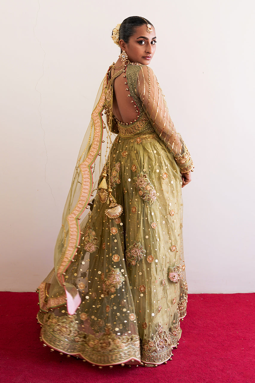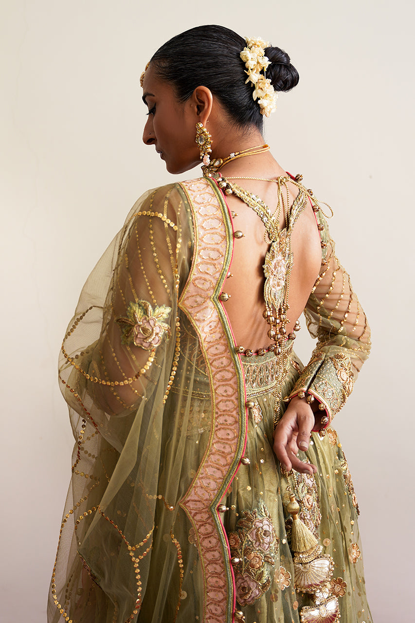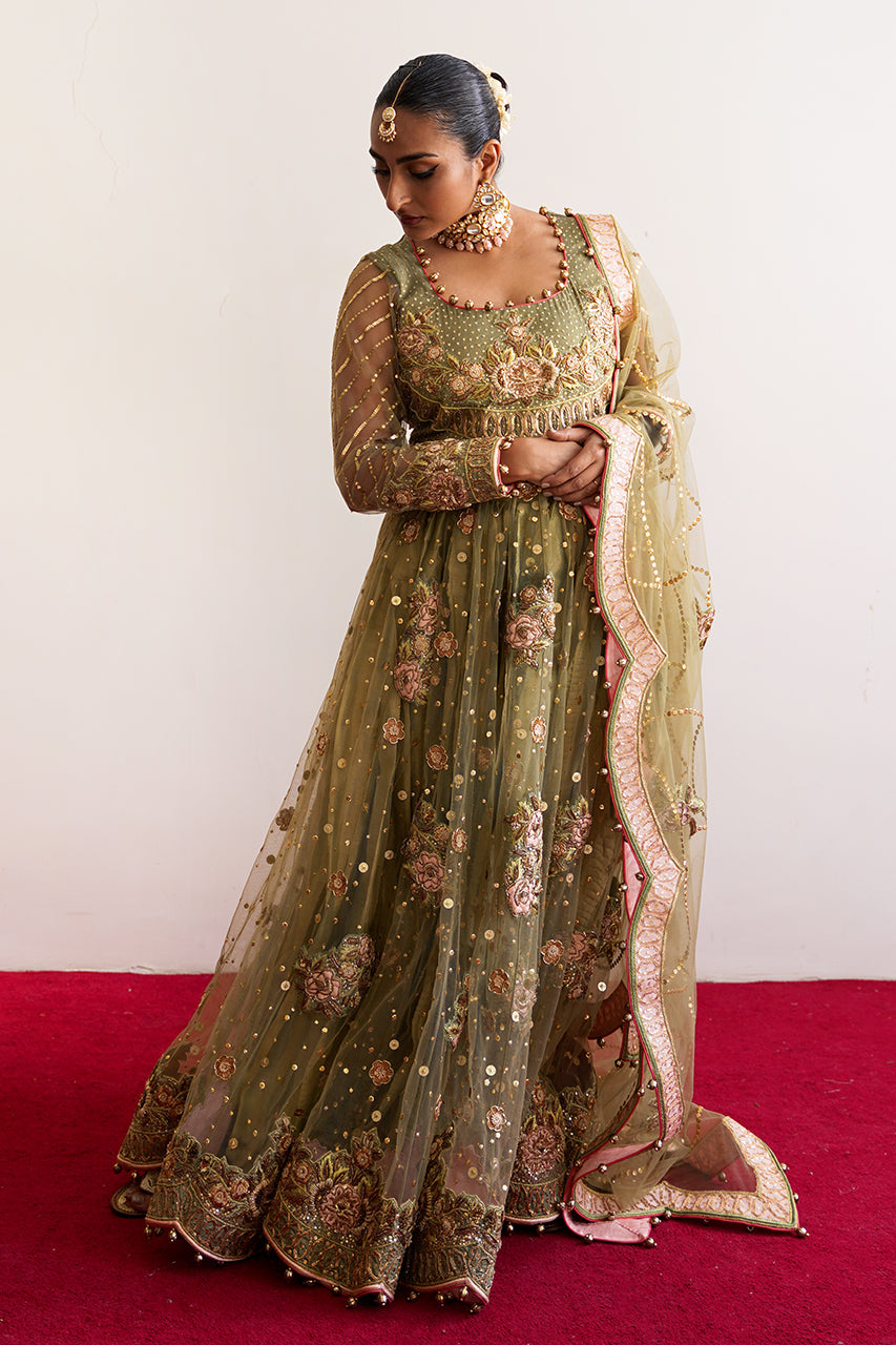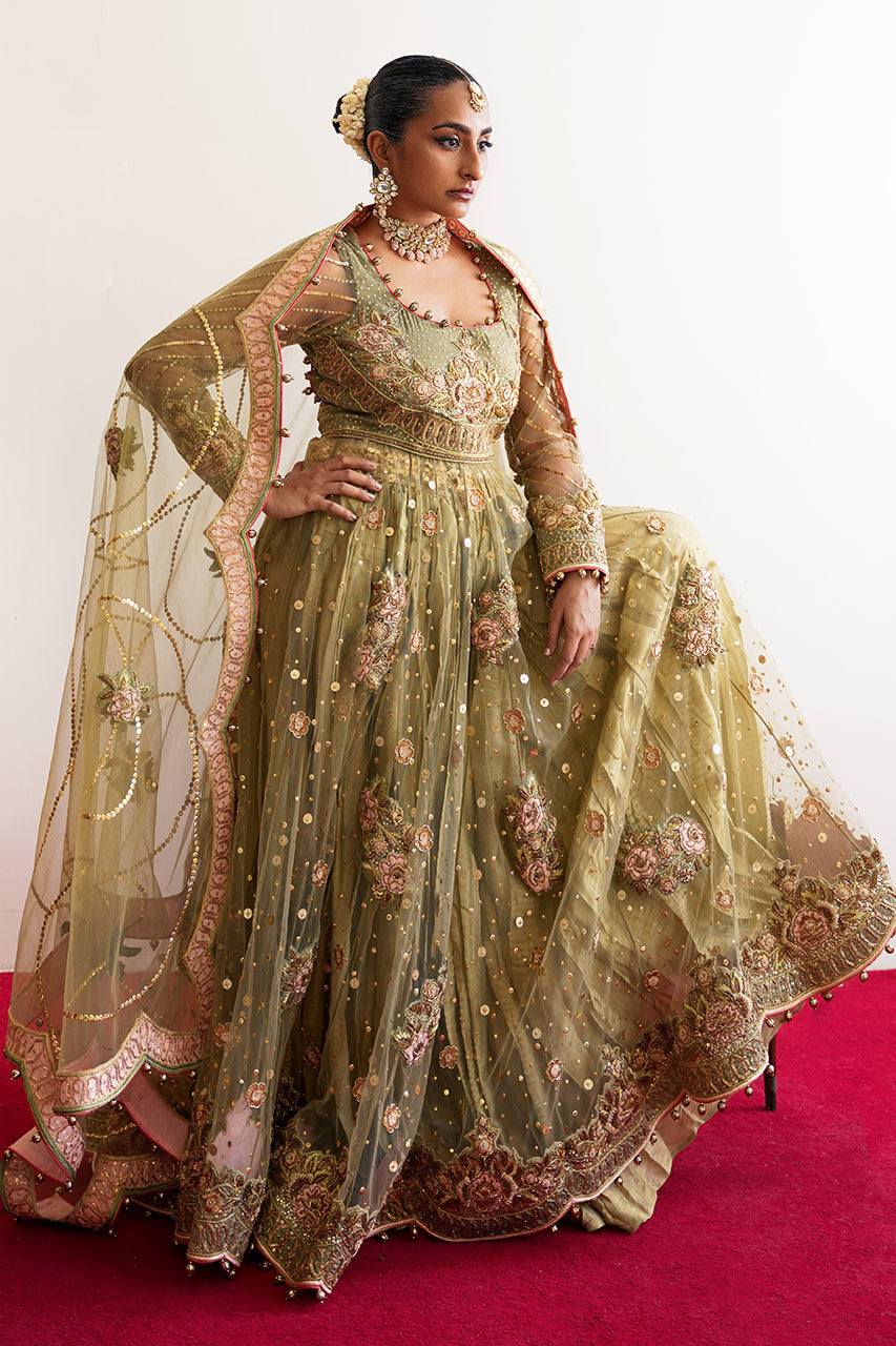 is a meticulously crafted kaalidar fully decorated with gold and rose gold aplique embroidery. The article is sprayed with gold sequence and a pair delicately embellished net dupatta with heavy apliqued borders