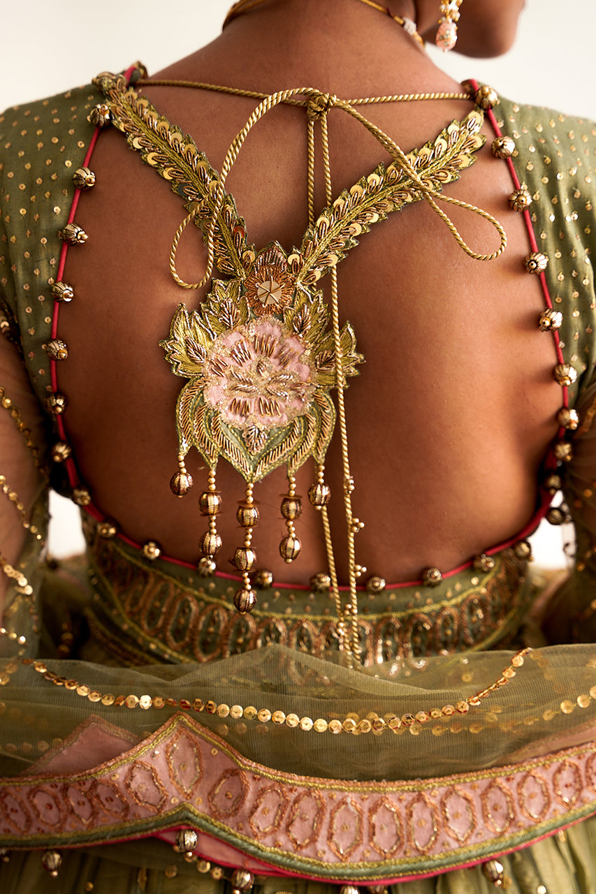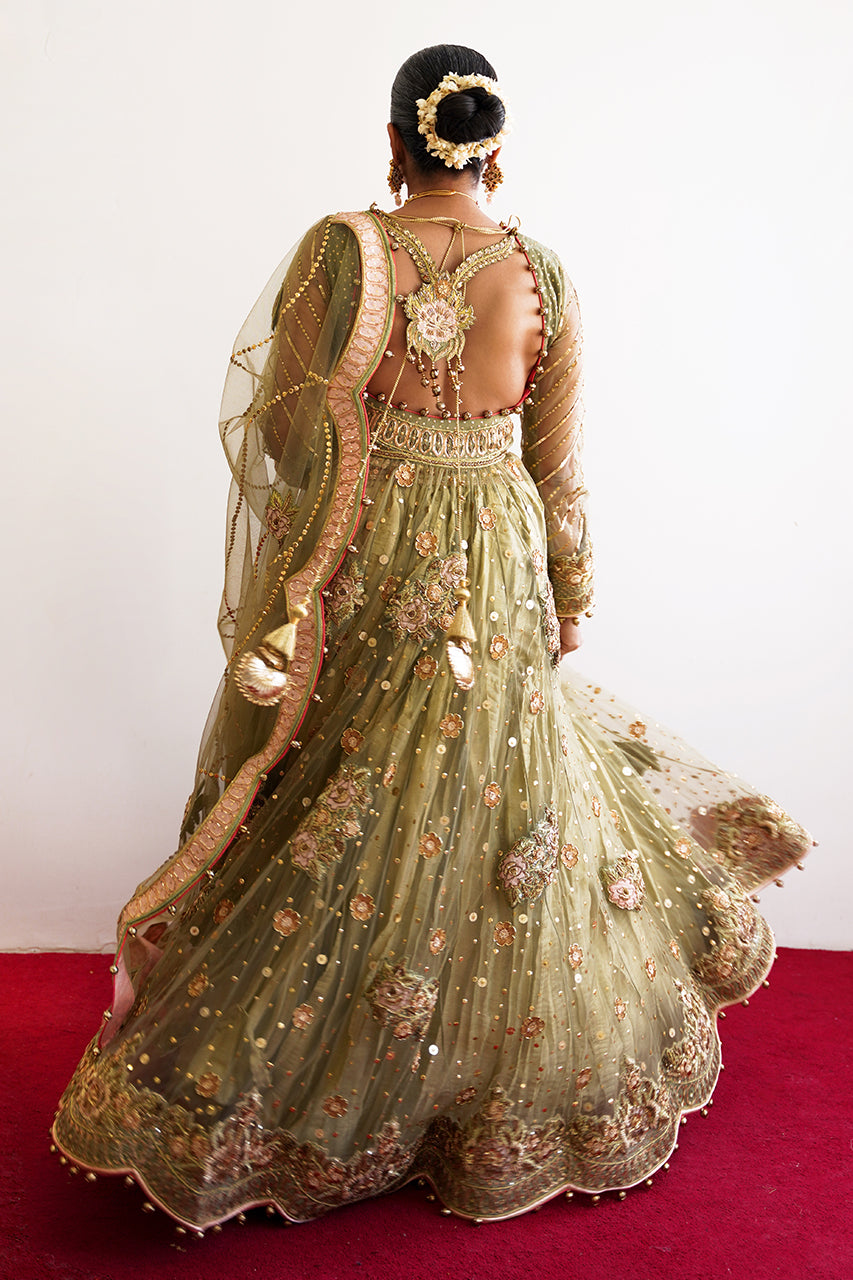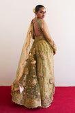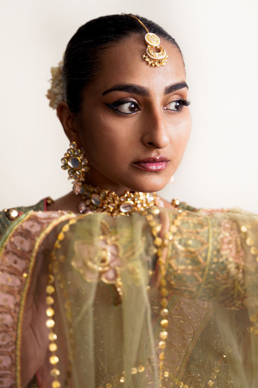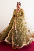 is a meticulously crafted kaalidar fully decorated with gold and rose gold aplique embroidery. The article is sprayed with gold sequence and a pair delicately embellished net dupatta with heavy apliqued borders
