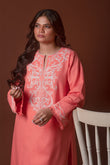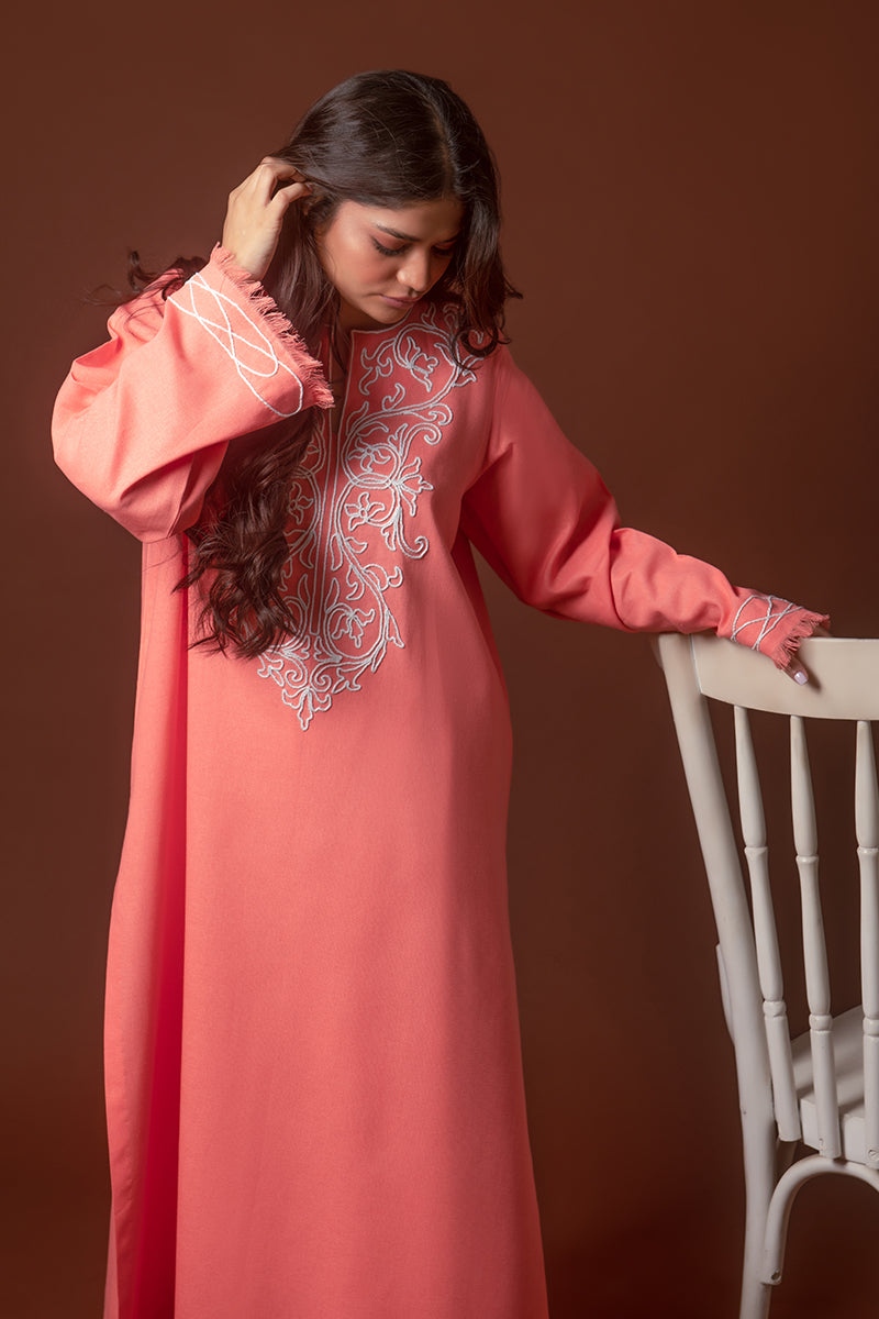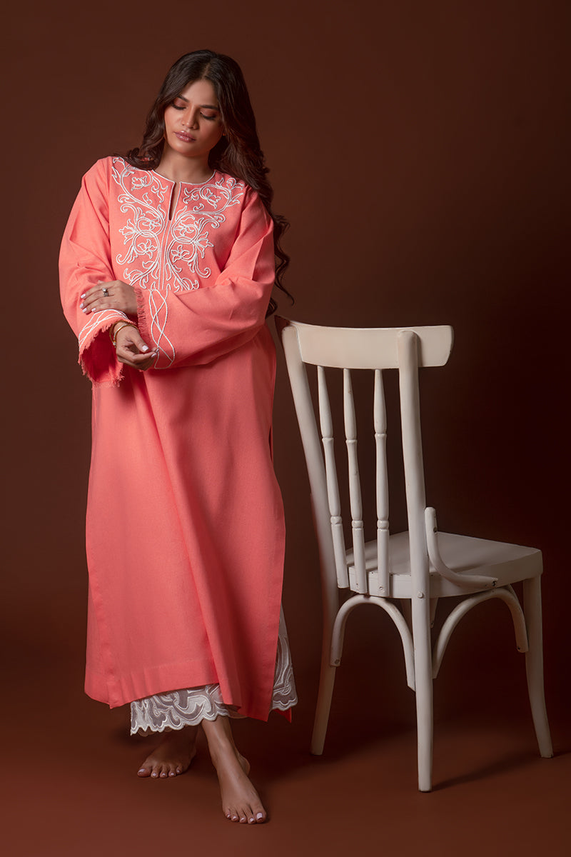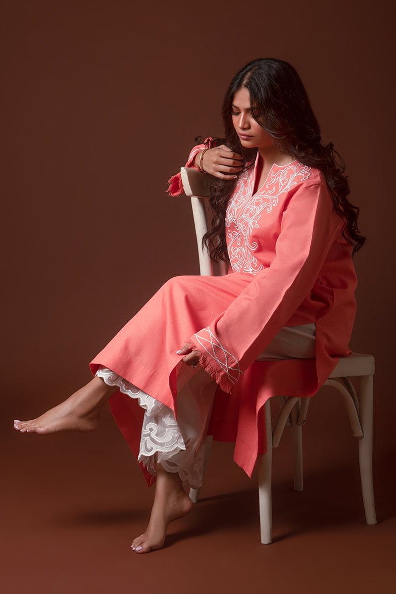This stunning ensemble, crafted from Irish linen, showcases a soft and breathable texture perfect for all seasons. The kurta is highlighted by intricate dori embroidery in a crisp white hue, creating an elegant contrast against the warm coral base. Delicate edges on the sleeves add a feminine charm, while the straight silhouette ensures a timeless and versatile appeal. Paired with lace-detailed trousers, this design exudes sophistication and ease, making it ideal for casual gatherings or festive occasions.