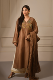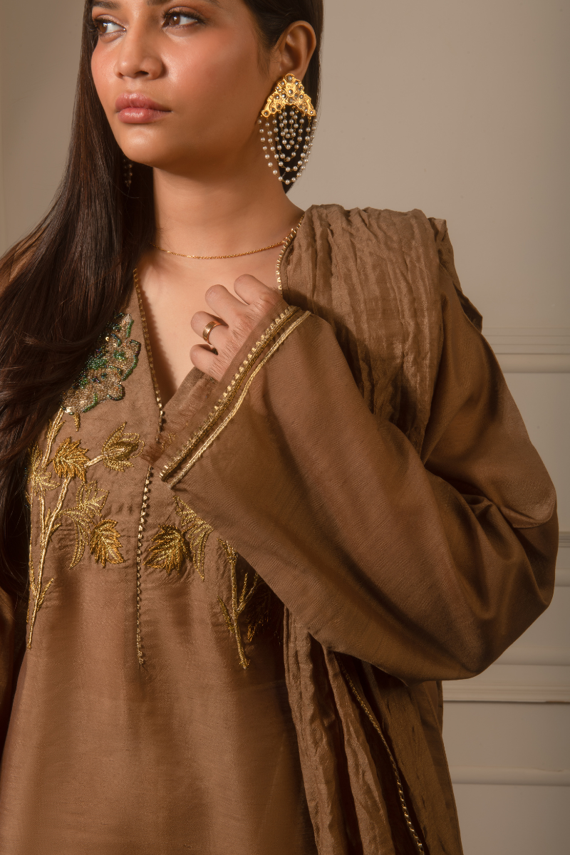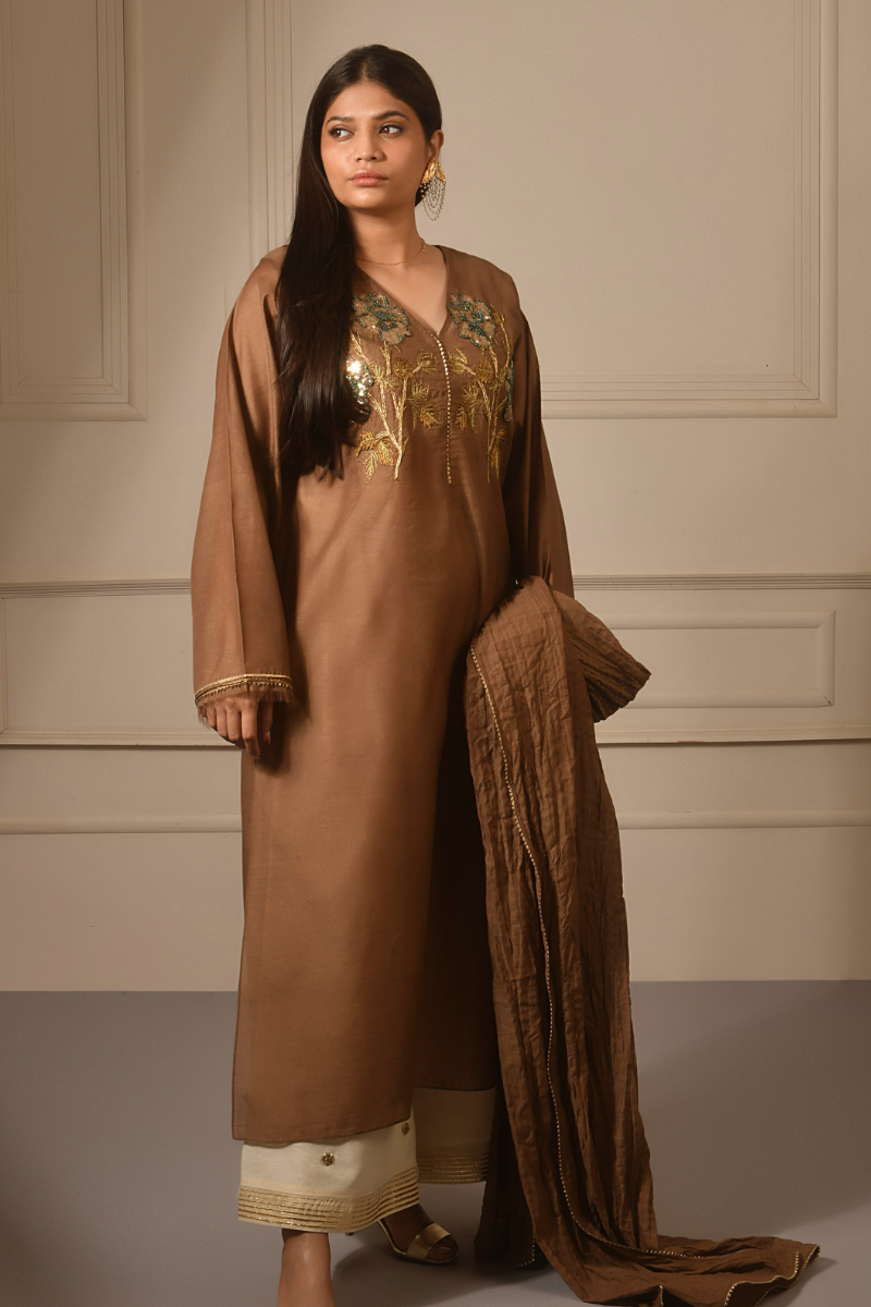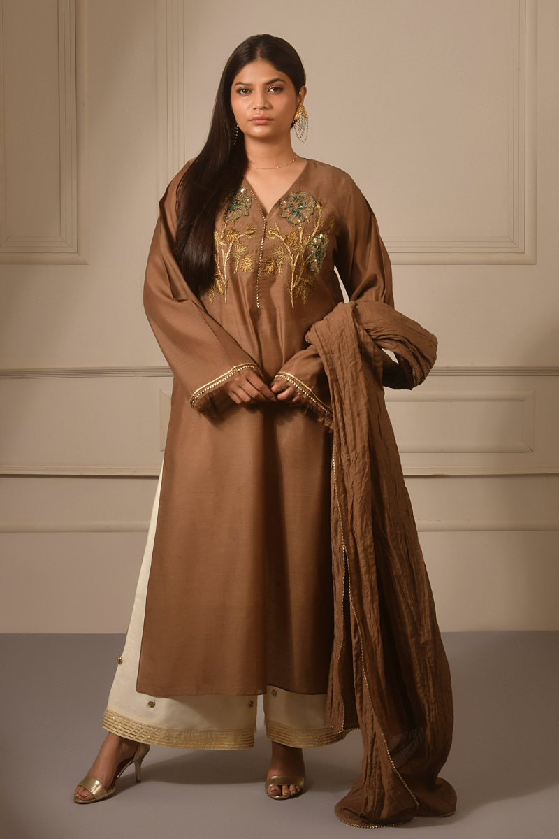 Delicate floral motifs bloom across this breezy paper cotton ensemble, celebrating nature’s poetry. The fabric’s organic texture and detailed embroidery evoke a sense of artisanal luxury, offering a timeless appeal that blends tradition with modern craftsmanship.
