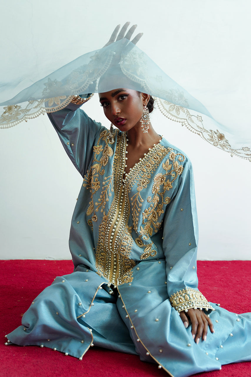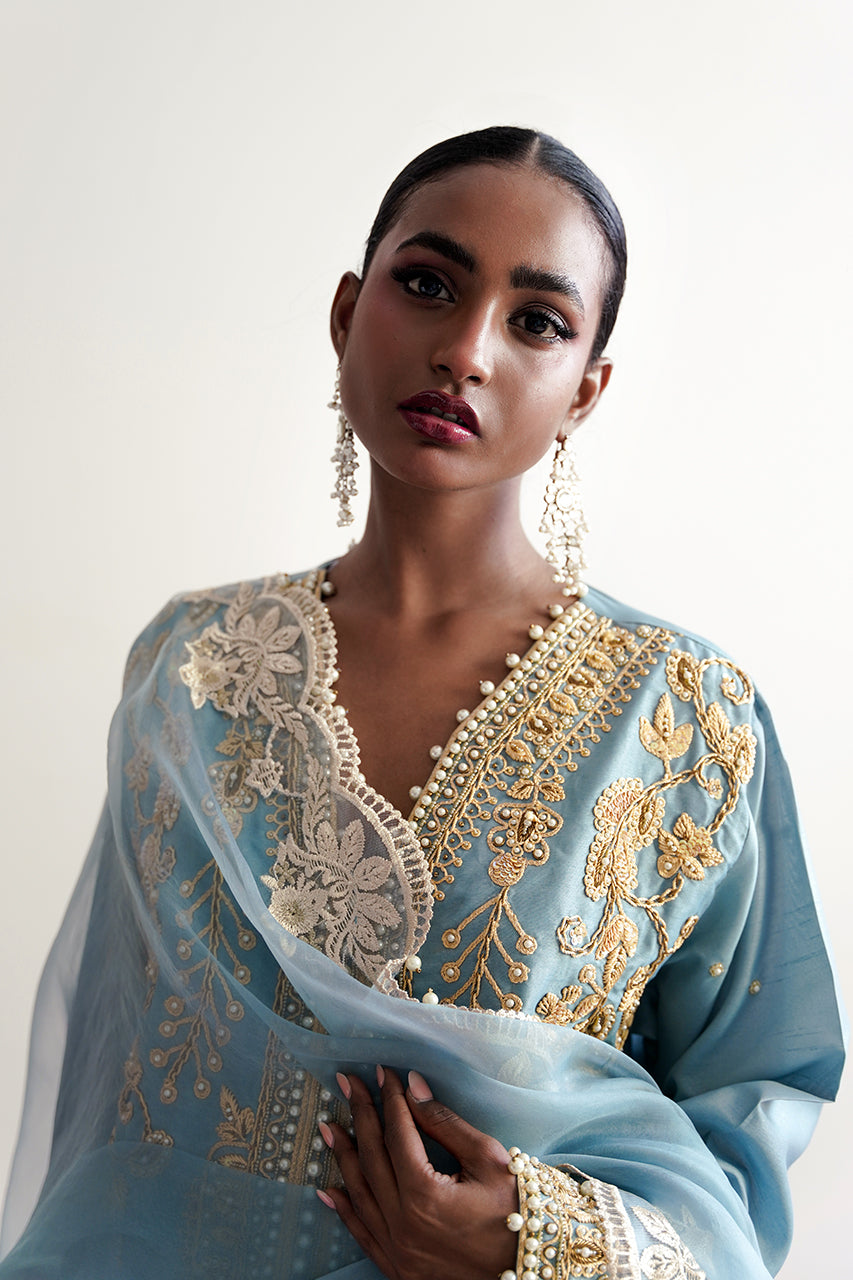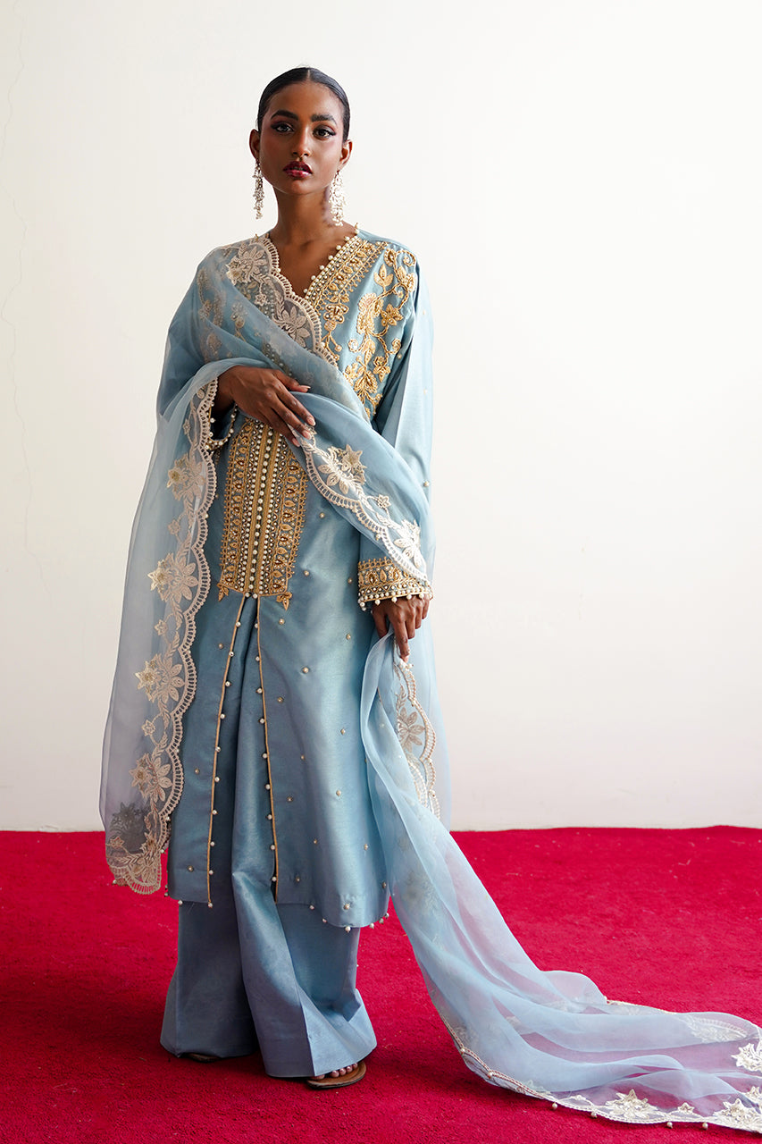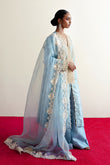 Ghazal is a front-open article, carfted in dori and pearl embellishments, it is paired with an organza emballished dupatta.This ice-blue beautiful attire is a celebration of a classic and a modern sensiblities.