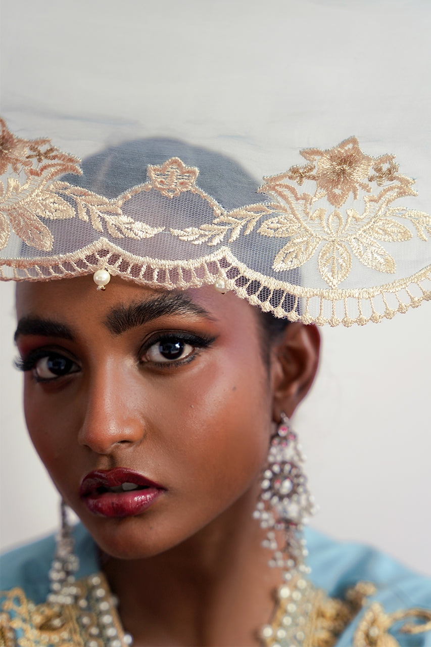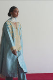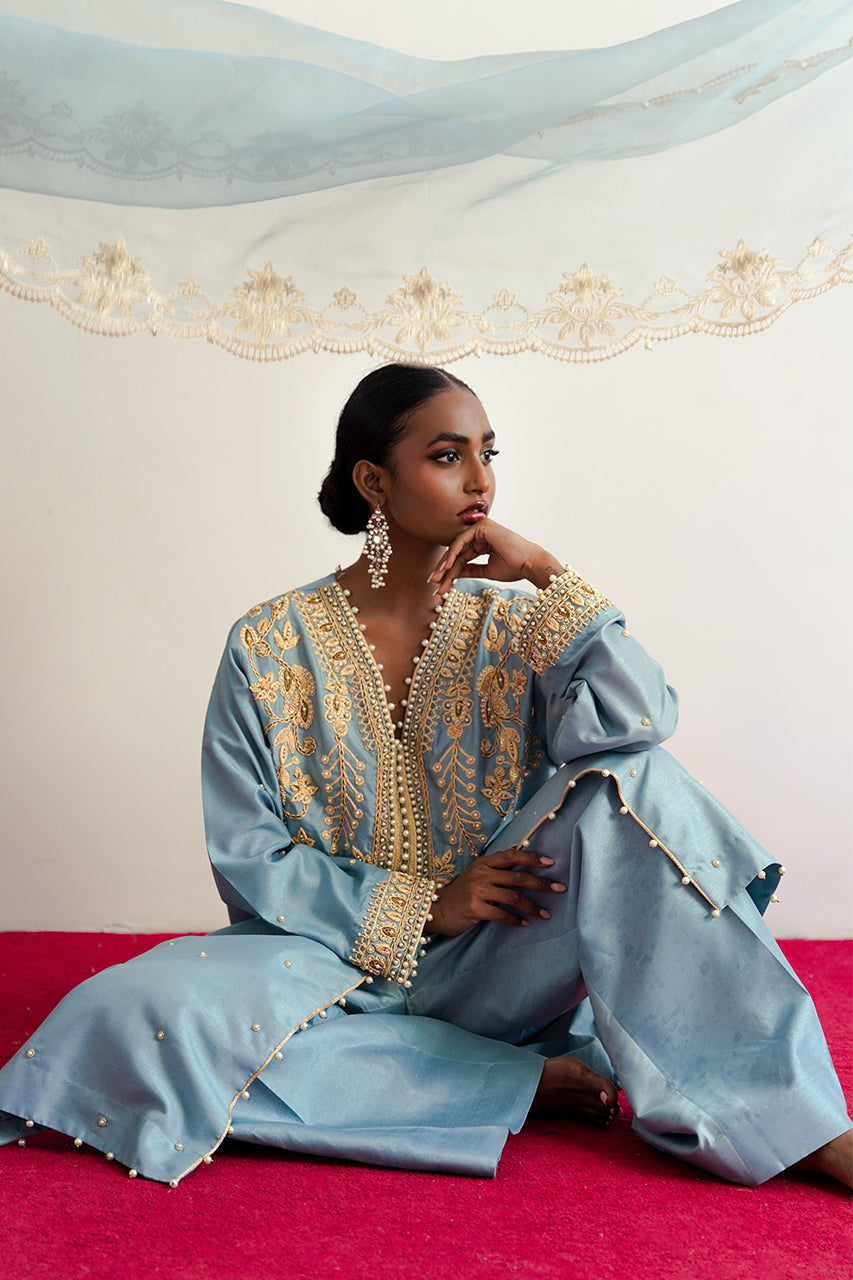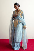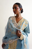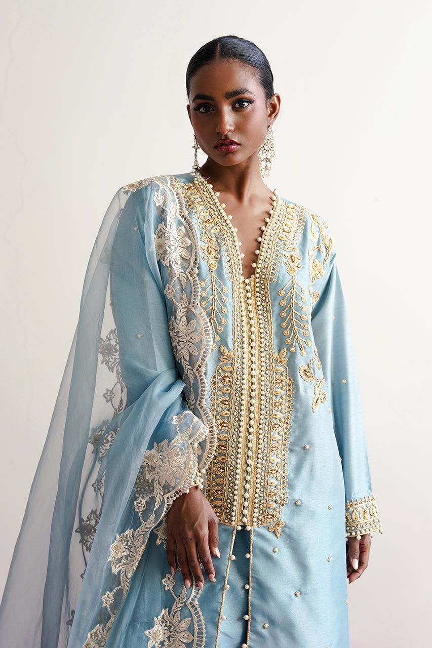 Ghazal is a front-open article, carfted in dori and pearl embellishments, it is paired with an organza emballished dupatta.This ice-blue beautiful attire is a celebration of a classic and a modern sensiblities.