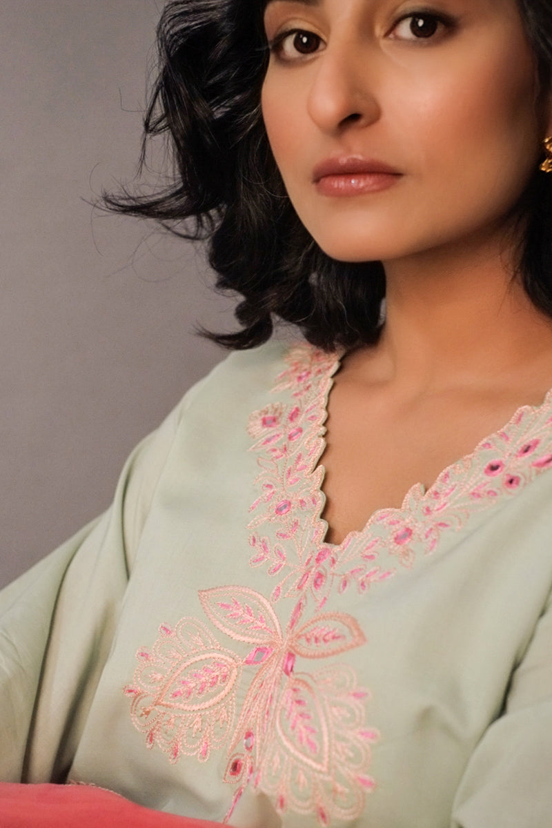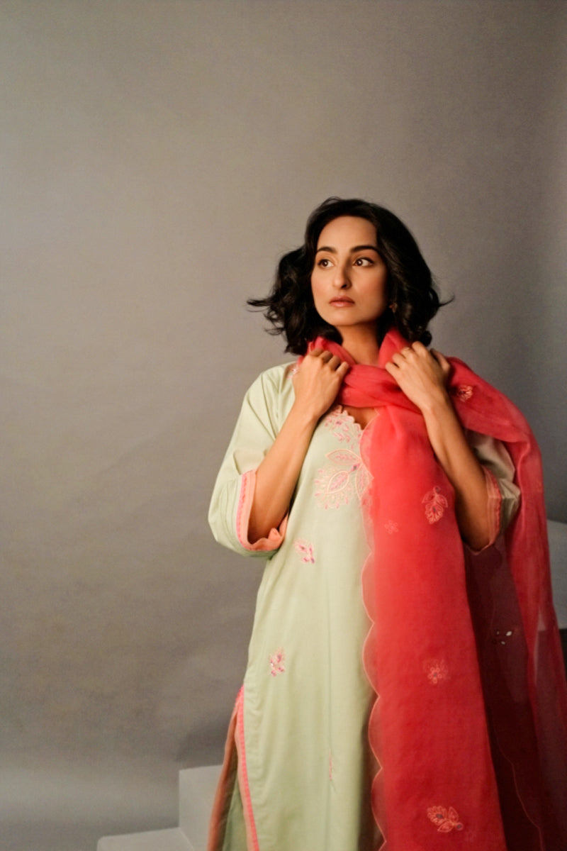 Golnar - fine cotton crafted with hand-embroidered cut work, finished with organza trim. Golnar is paired with skinny shalwar and embroidered, scalloped organza dupatta.