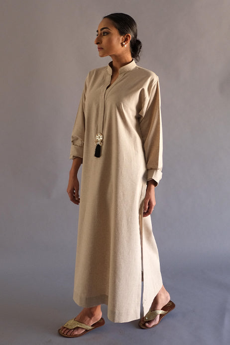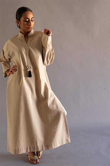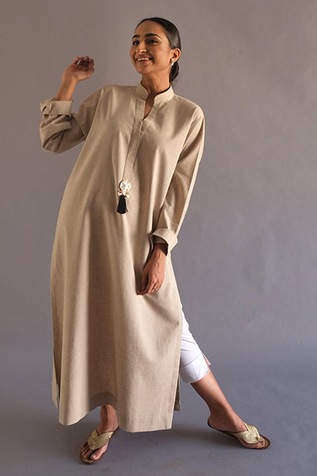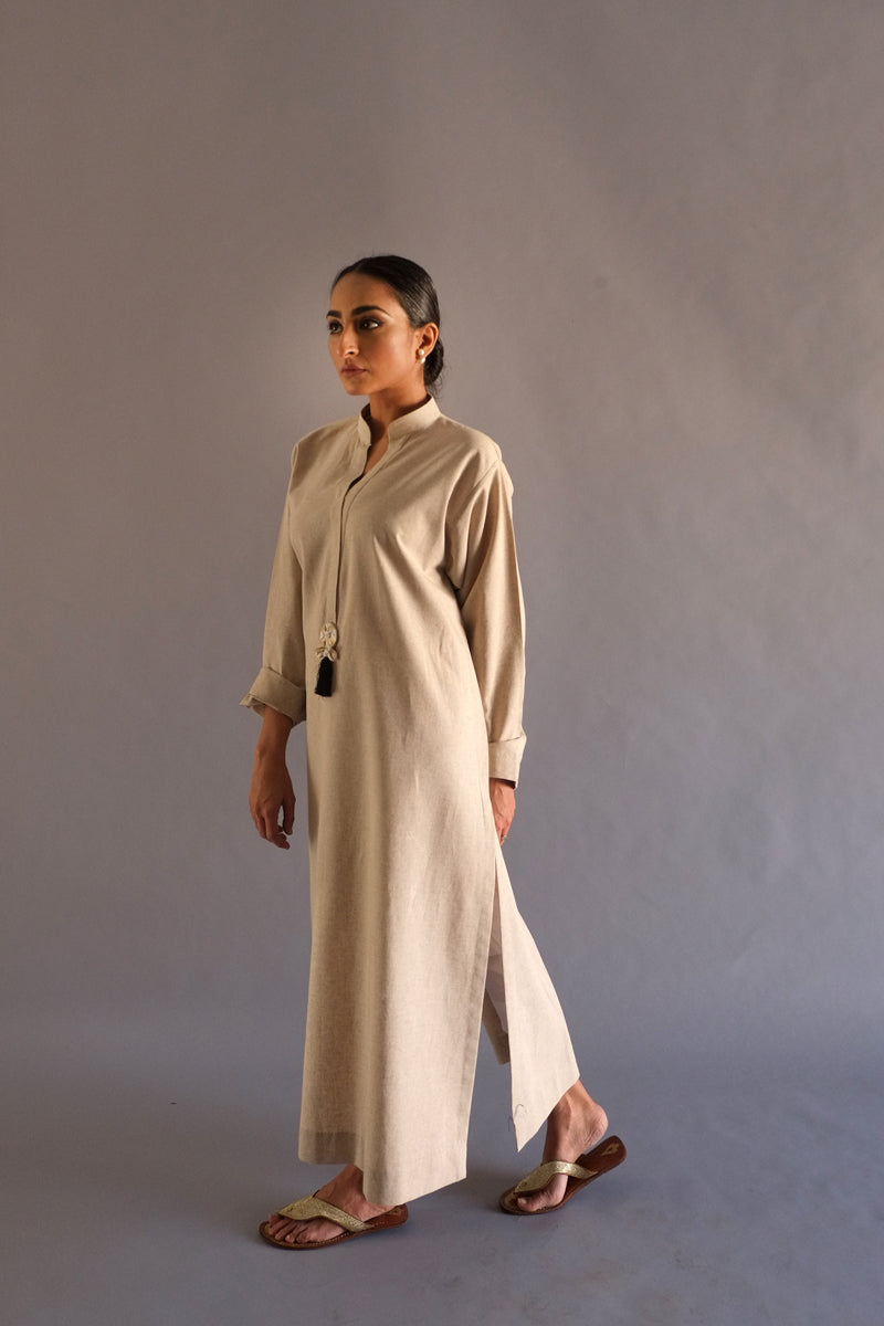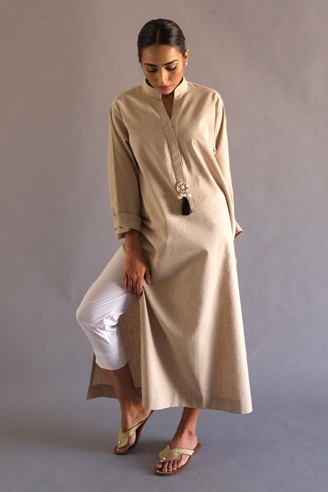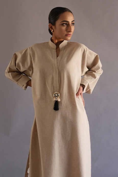 Hazel is one size, relaxed-cut lInen Kurta, finished with a mirrored and sea shell Tassled Button.