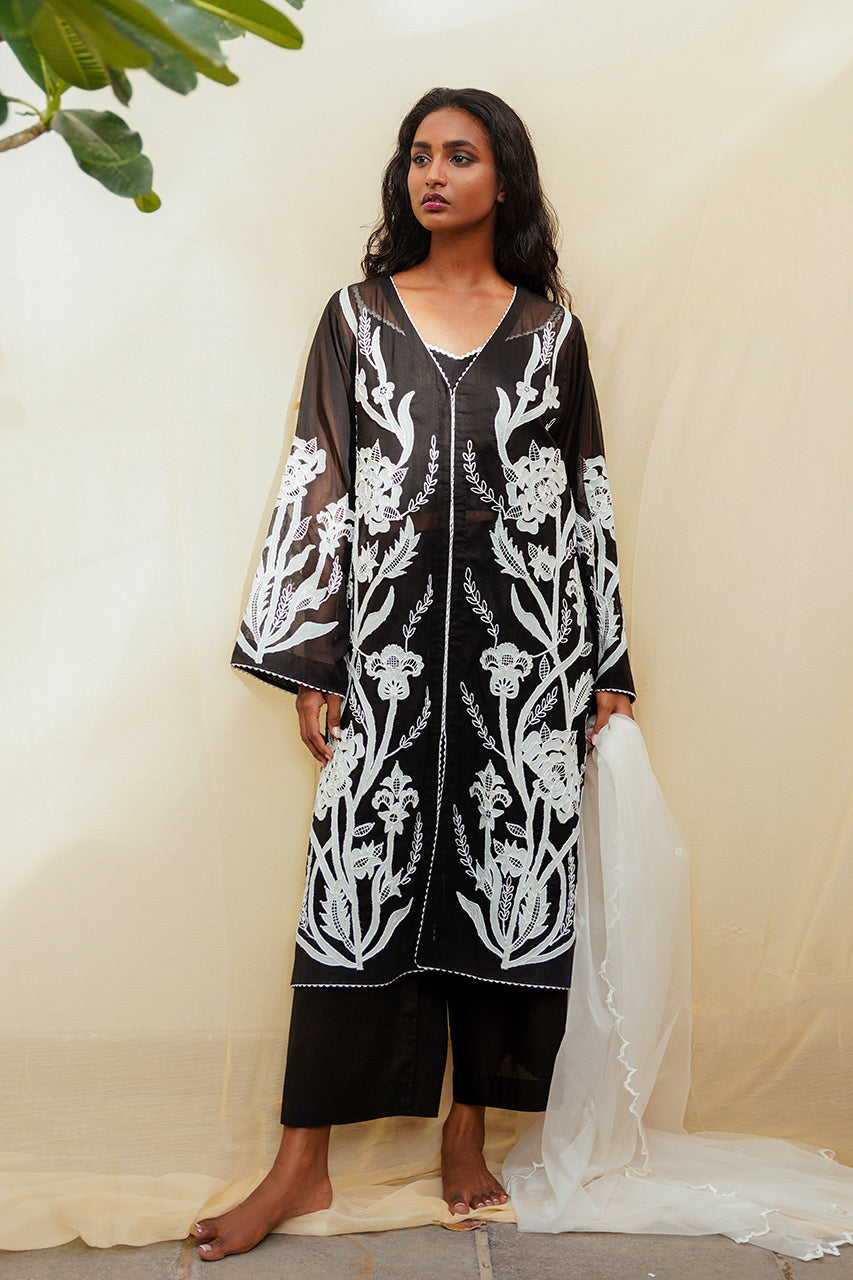ISABEL is made in Swiss voil and adorned with intricate hand appliquéd floral embroidery and cutwork, adding a touch of elegance and sophistication to its overall design.The floral embroidery is delicately hand-sewn onto the fabric, showcasing the skilled craftsmanship of the person who created it. The cutwork adds an additional layer of intricacy to the garment, enhancing its beauty even further.