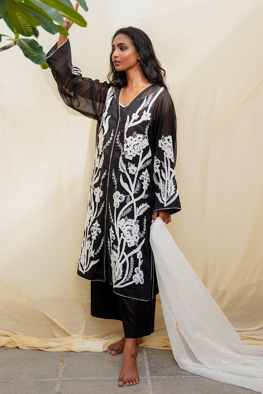 This garment is paired with azaar, The azaar complements the delicacy of the Swiss voil fabric and adds a traditional touch to the overall outfit. The organza dupatta, which is a sheer and lightweight fabric, completes the look with its subtle yet beautiful texture.