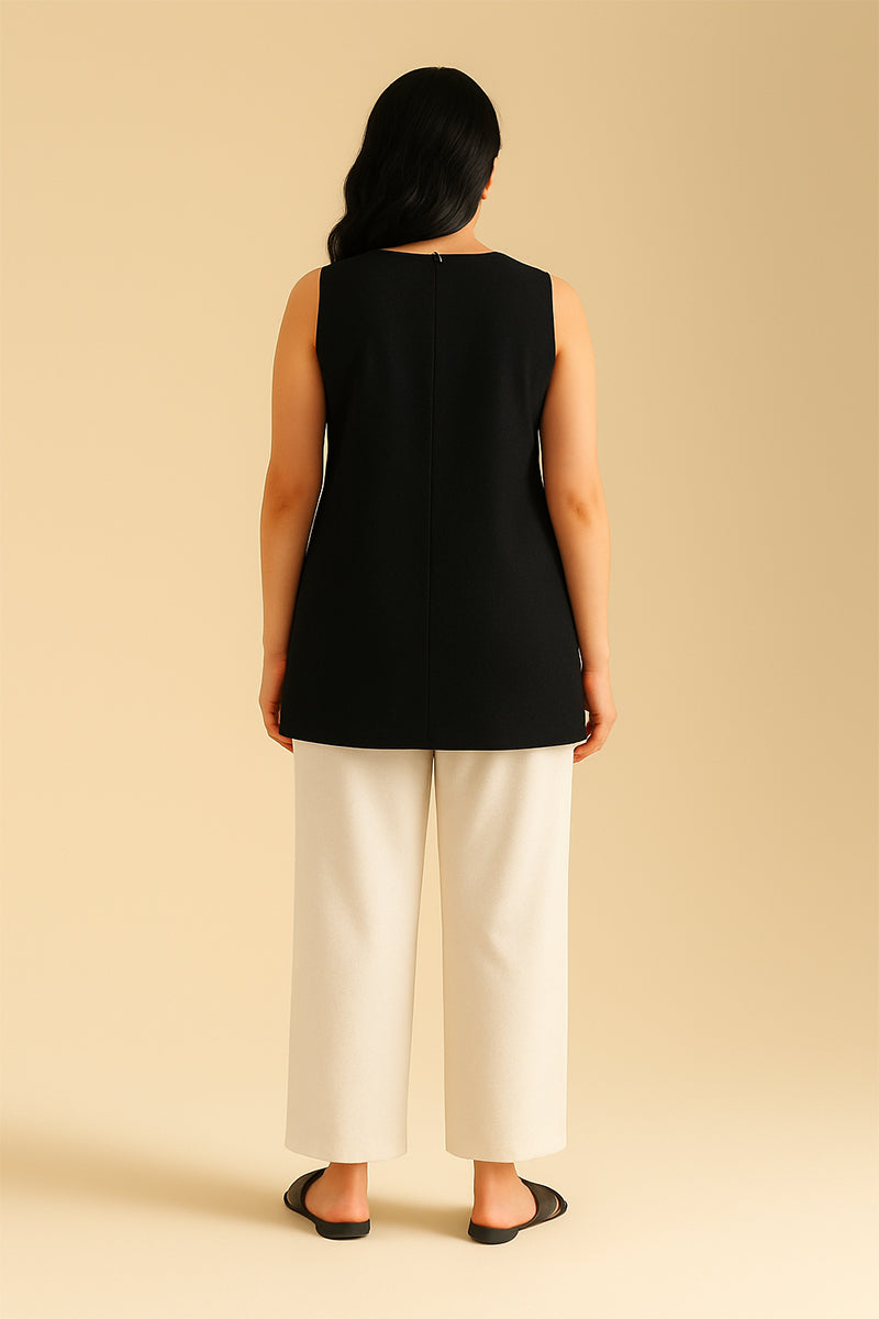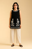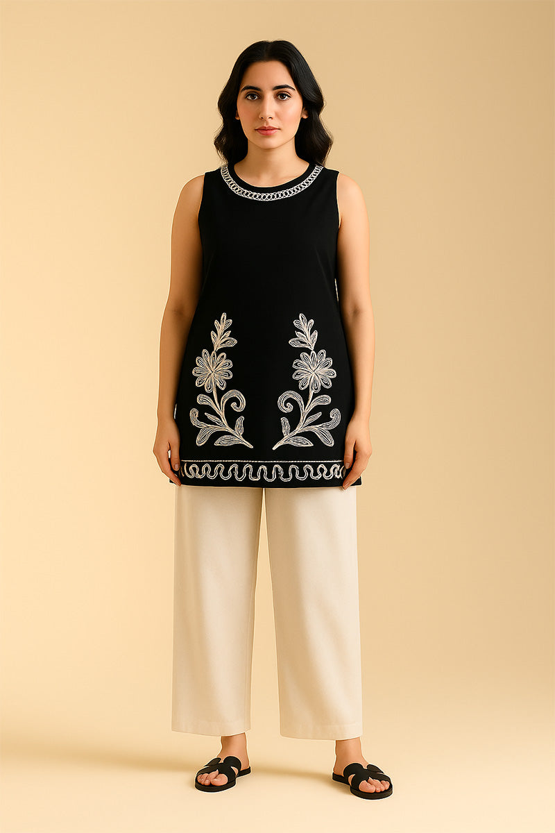 An effortless essential with a touch of craft — the Ivory Bloom features a sleeveless black shirt adorned with delicate ivory dori embroidery. Stylized floral motifs bloom across the hem, while a simple embroidered neckline adds quiet detail. Paired with wide-leg ivory trousers, this set is easy, elegant, and designed for everyday wear with subtle flair.