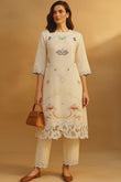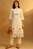 LEA is a whisper of romance in linen. A two-piece suit hand-embroidered with delicate swans, scrolls, and scattered hearts—each motif a memory made permanent in thread. Inspired by old love letters and the stillness of handwritten devotion, this ivory Irish linen set carries the quiet luxury of slowness. The kurta features flared sleeves and a scalloped hem kissed with lavender cutwork—now mirrored at the sleeve ends as a finishing touch. Paired with matching straight trousers, it’s designed for the woman who dresses in nostalgia and walks in grace. Soft. Story-filled. Forever-worthy. A piece to hold on to.
