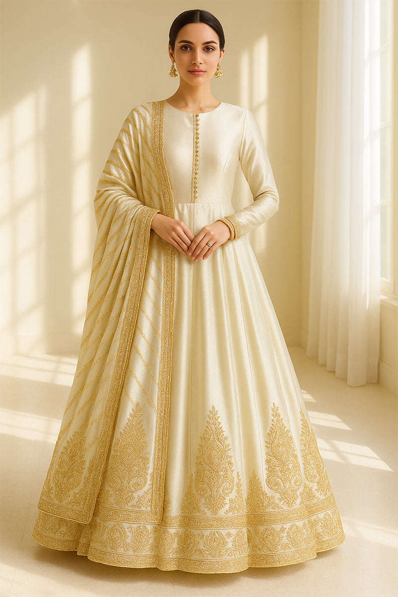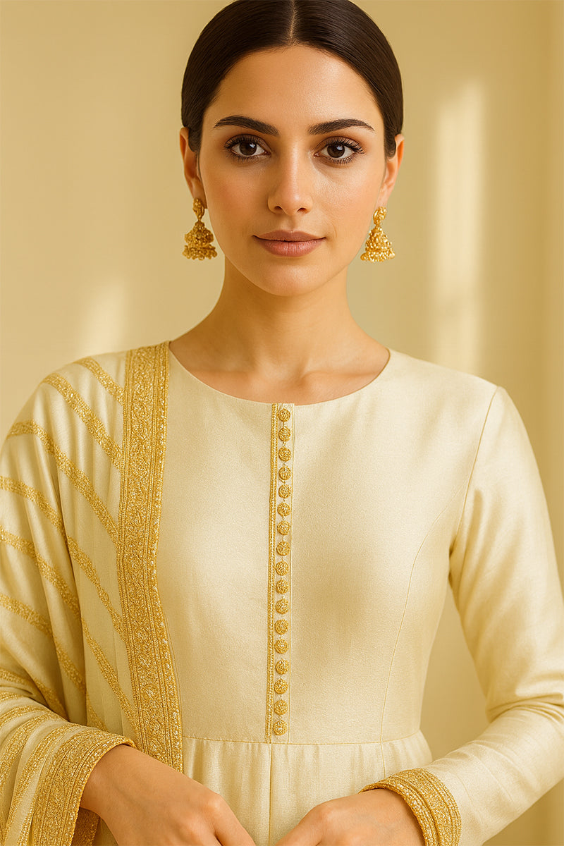 A vision of understated grandeur, the Liana Ivory Peshwas is crafted from luxurious Korean silk, exuding a subtle sheen that catches the light with every movement. The ensemble features a classic round neckline and a fitted bodice adorned with delicate tonal buttons. The voluminous flare of the peshwas is accentuated with intricately embroidered motifs in antique gold thread, inspired by Mughal paisley artistry. The dupatta, detailed with diagonal zari stripes and a gilded border, completes the look with timeless grace — perfect for weddings, festive soirées, or refined evening gatherings.