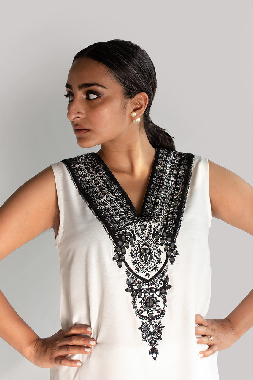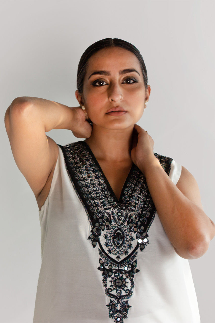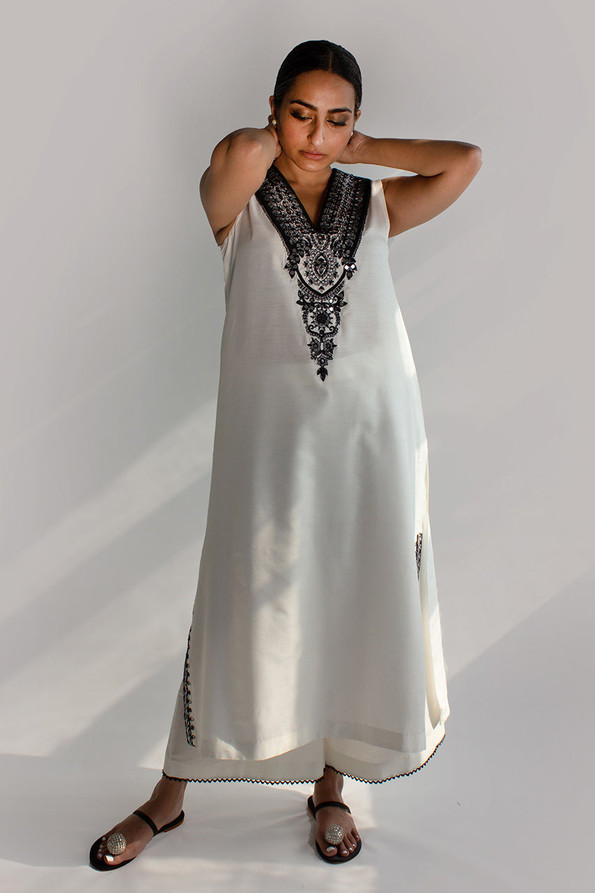 Behold the epitome of grace and opulenceâ€â€a resplendent attire crafted in Khaadi silk and adorned with exquisite Ari and mirror work. Khaadi silk, renowned for its lustrous texture and luxurious drape, forms the canvas for this masterpiece, creating a garment that epitomizes elegance and sophistication.