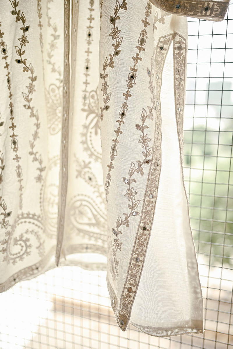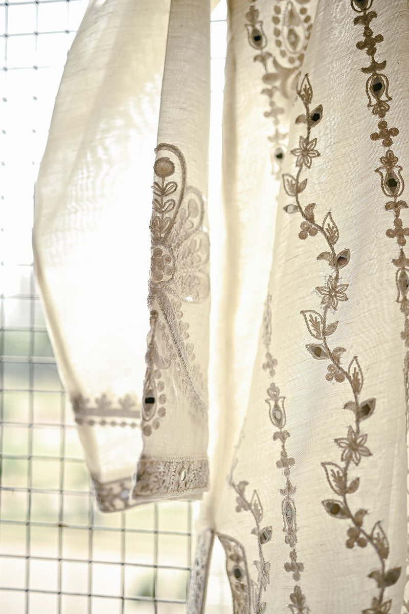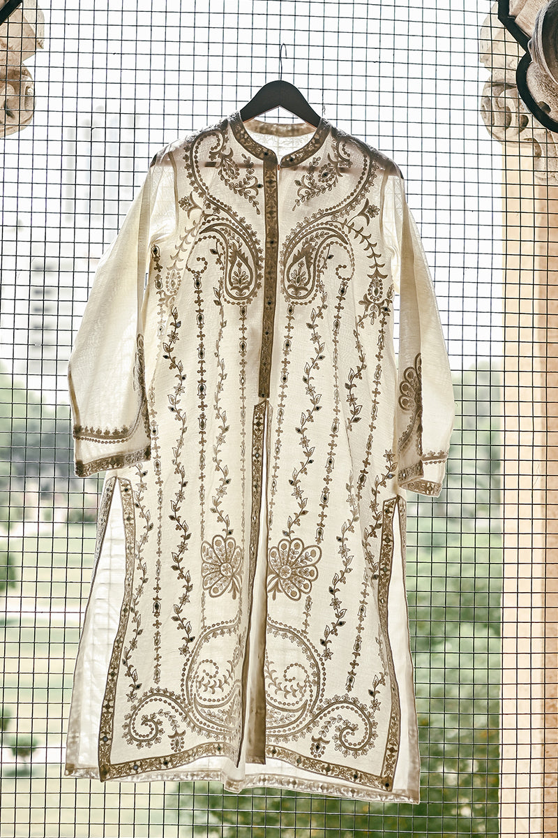 Crafted in fine paper cotton, MAHRUKH embodies the elegance of heritage craftsmanship through a contemporary lens. The silhouette flows effortlessly with minimal tailoring and soft hand-finished detailing, evoking timeless grace. Its breathable texture and structured drape make it a versatile choice for both quiet daywear and understated evenings — a piece that honors tradition while embracing modern ease.