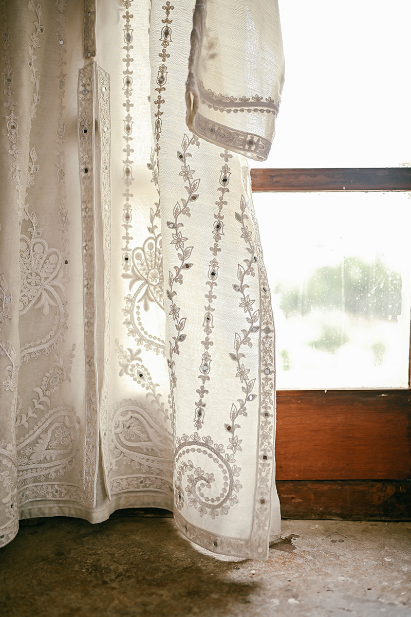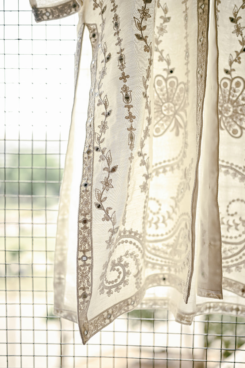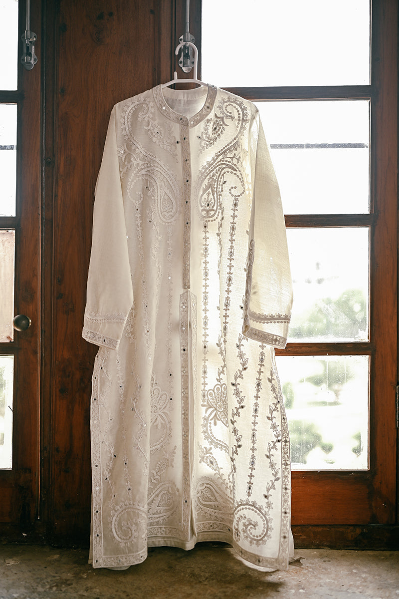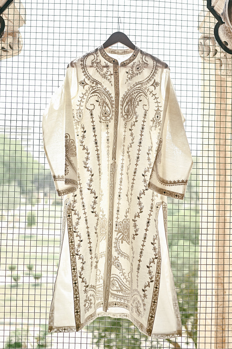 Crafted in fine paper cotton, MAHRUKH embodies the elegance of heritage craftsmanship through a contemporary lens. The silhouette flows effortlessly with minimal tailoring and soft hand-finished detailing, evoking timeless grace. Its breathable texture and structured drape make it a versatile choice for both quiet daywear and understated evenings — a piece that honors tradition while embracing modern ease.