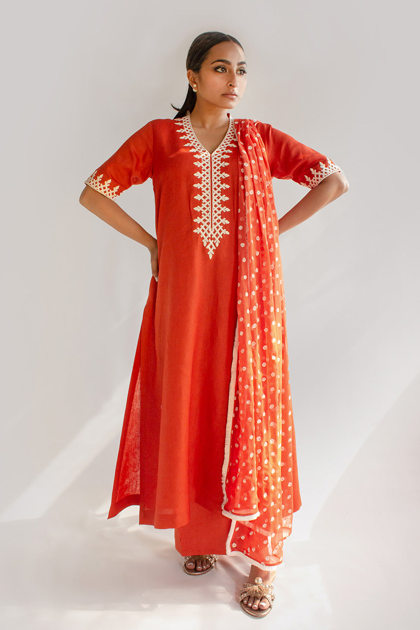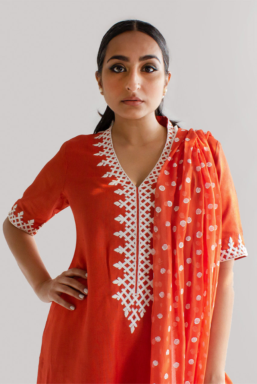 Complementing the kurta is a Block Print Chiffon Dupatta that adds an extra layer of grace to the ensemble. The dupatta features a mesmerizing block print design, inspired by traditional motifs. The lightweight chiffon fabric adds a touch of ethereal charm, allowing you to move with grace and ease. Whether draped casually over the shoulders or styled in a traditional manner, the dupatta completes the ensemble with finesse.