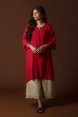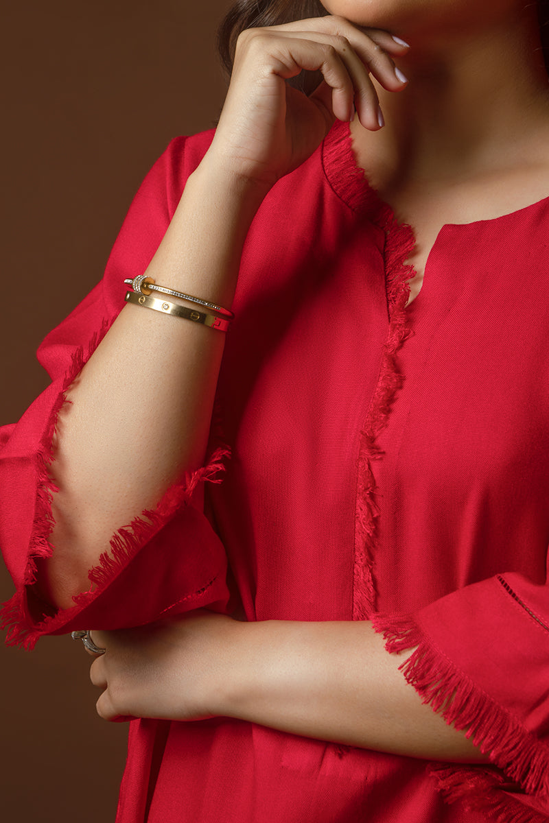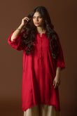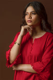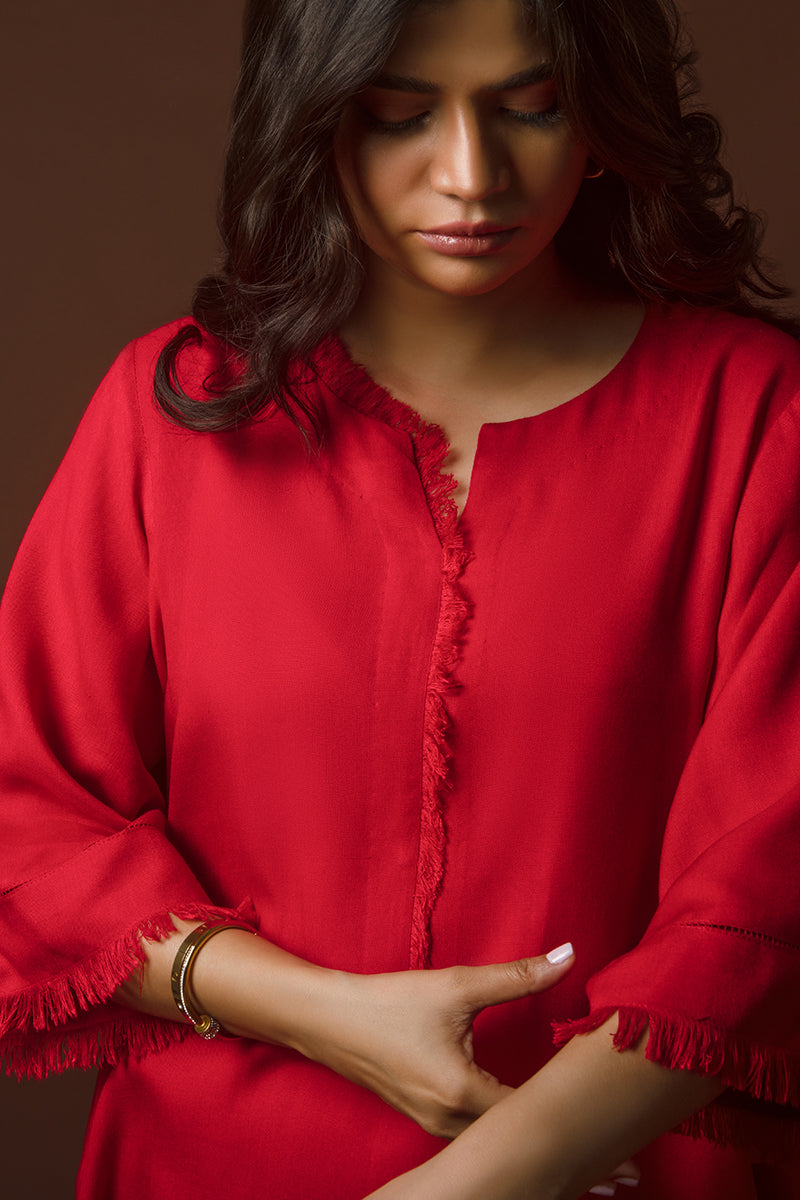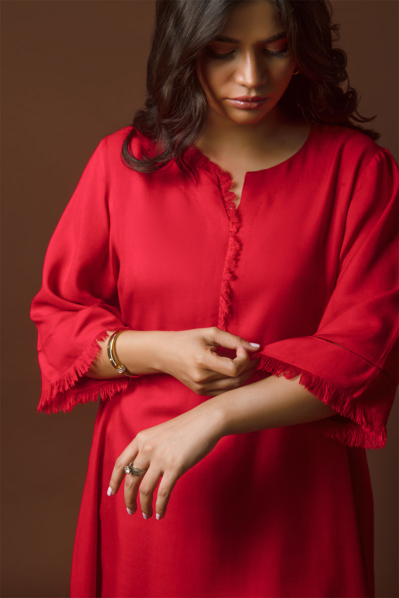 This vibrant kurta is crafted from susi fabric, known for its lightweight texture and subtle sheen. The article features a striking red hue complemented by delicate frayed edges along the neckline, sleeves, and hem, adding a touch of effortless charm. Its relaxed silhouette ensures comfort and versatility, making it ideal for both casual and semi-formal occasions. Paired with soft beige trousers featuring intricate lace detailing, this ensemble radiates elegance and timeless appeal.
