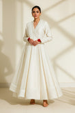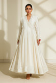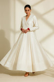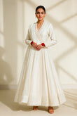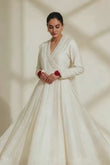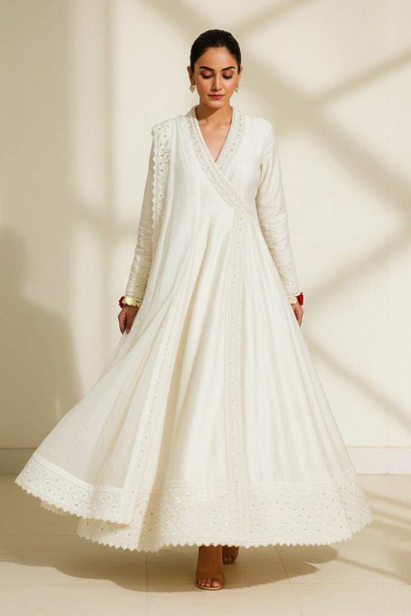 The Meher Ivory Silk Angharka redefines elegance with its fluid silhouette and refined craftsmanship. Tailored from pure silk, this wrap-style angharka features delicately hand-embroidered borders enriched with pearls and resham threadwork. The voluminous flare, intricate detailing on the sleeves, and tonal embroidery along the hem exude quiet opulence. Paired with a matching dupatta edged in fine lace, this ensemble captures timeless sophistication — perfect for formal occasions or serene evening gatherings.
