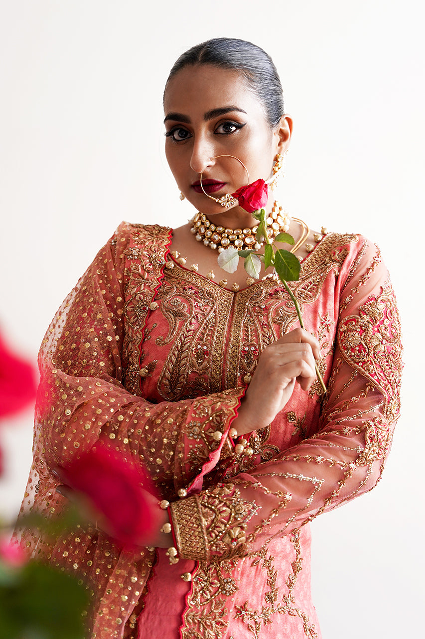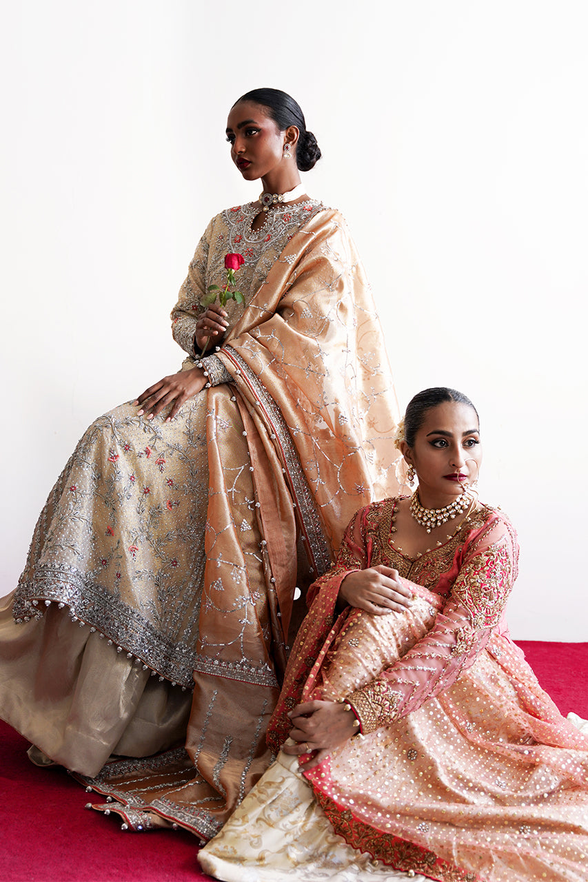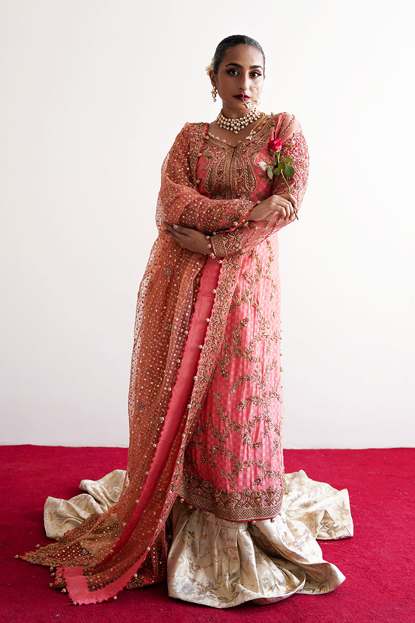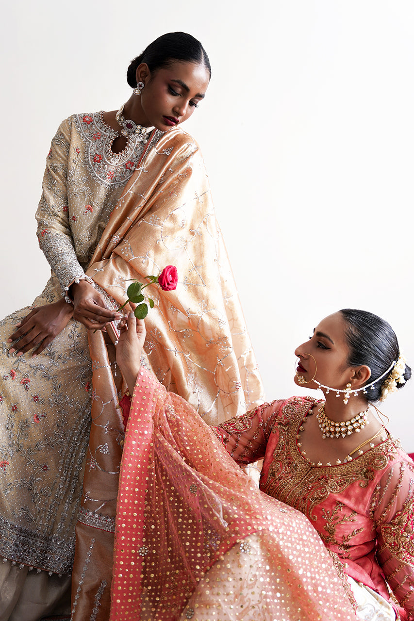 MEHRUNNISA is a bridal ensemble crafted from luxurious cotton net, featuring a farshi gharara that beautifully blends South Asian bridal charm with a modern, relaxed demure. The intricate detailing on the cotton net, combined with the flowing silhouette of the farshi gharara, creates an opulent yet effortlessly graceful look. This fusion of traditional richness and contemporary ease captures the essence of South Asian bridal elegance in a modern context.