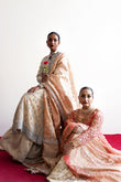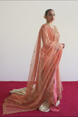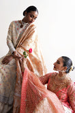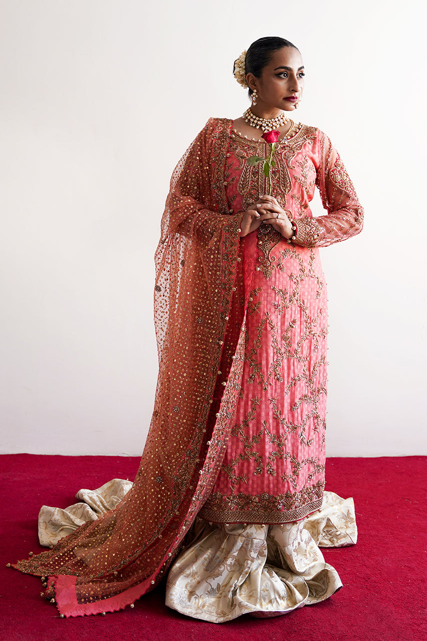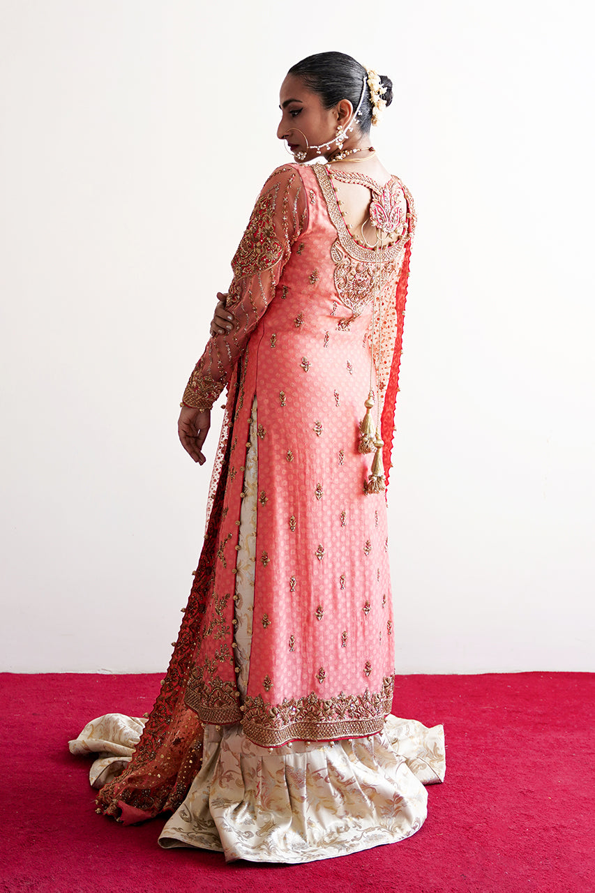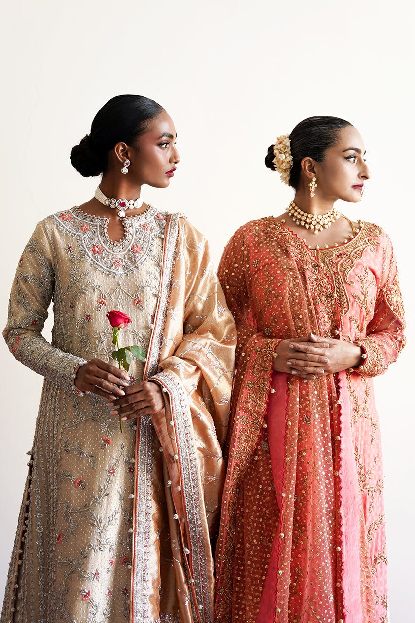 MEHRUNNISA is a bridal ensemble crafted from luxurious cotton net, featuring a farshi gharara that beautifully blends South Asian bridal charm with a modern, relaxed demure. The intricate detailing on the cotton net, combined with the flowing silhouette of the farshi gharara, creates an opulent yet effortlessly graceful look. This fusion of traditional richness and contemporary ease captures the essence of South Asian bridal elegance in a modern context.