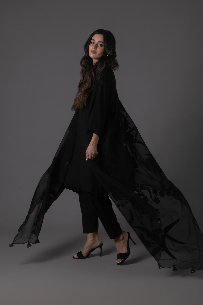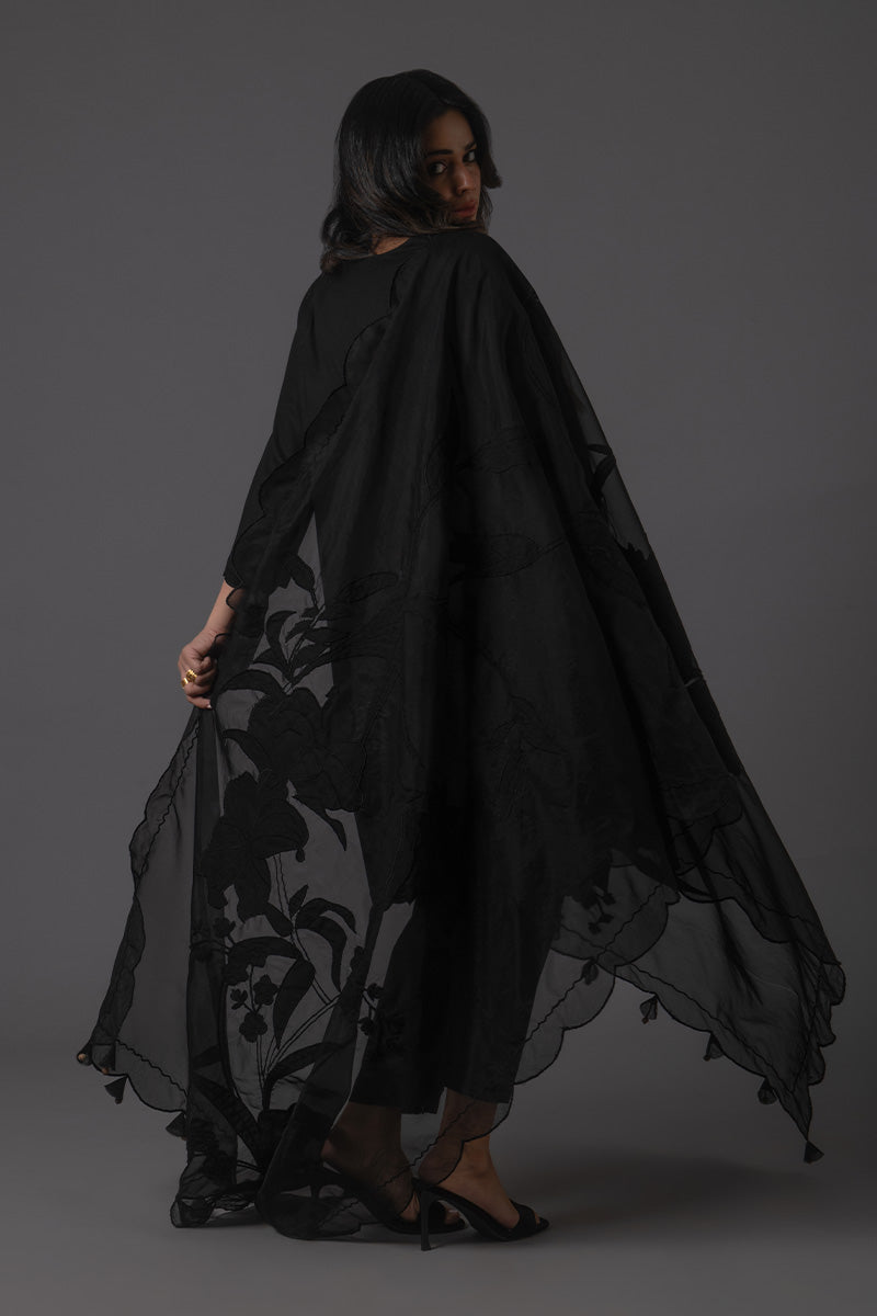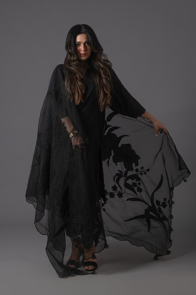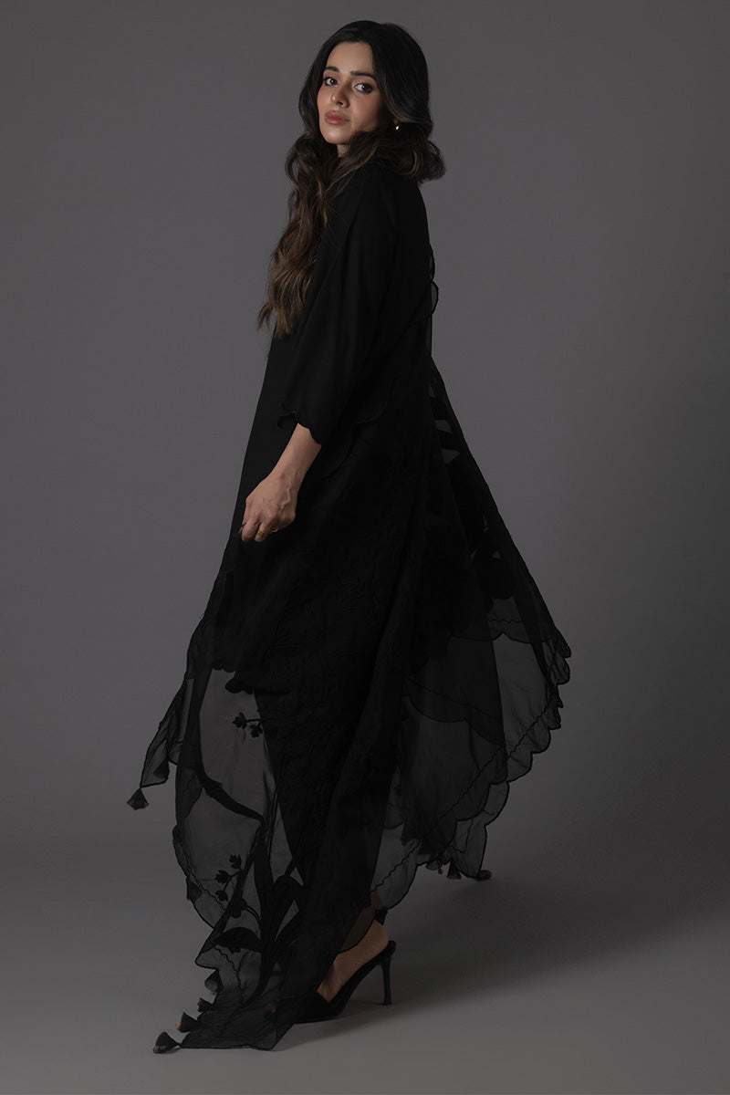 Mina NIGHT, true craftsmanship is showcased in its dupatta, meticulously hand-appliqued with silk organza and adorned with intricate thread cutork The dupatta features elegant organza tassels, seashell accents, and Dated with sus thir enhanced by organea scalaged dtaling angle. Its compiemented with a sieek sust sainny shanar. This crisemble embodies a perfect blend of artistry and sophistication.ÂÂÂ