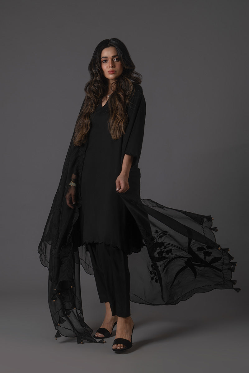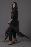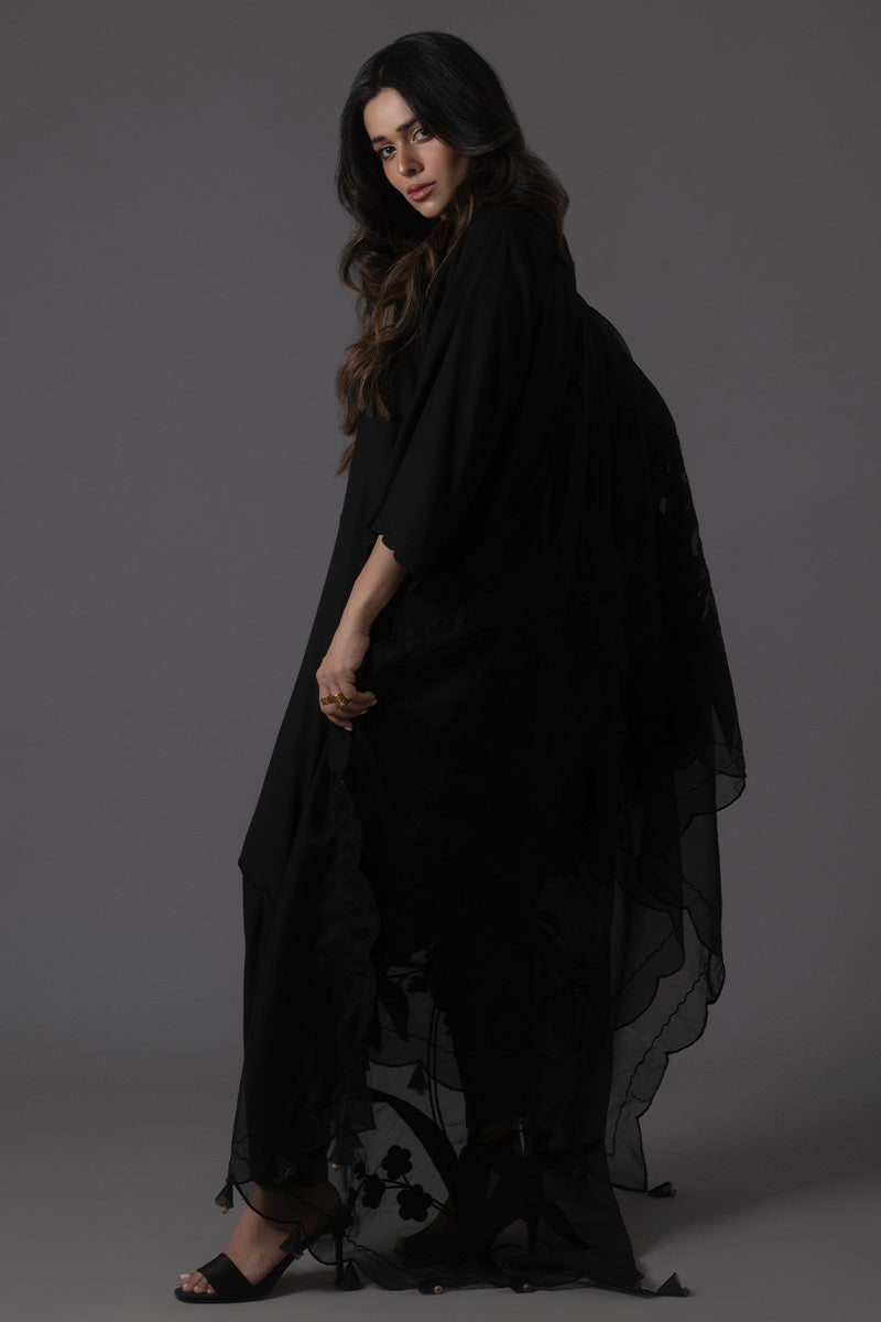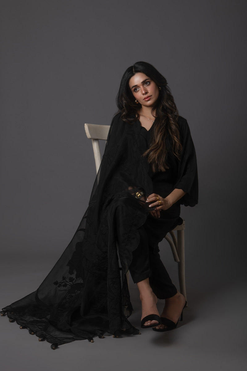 Mina NIGHT, true craftsmanship is showcased in its dupatta, meticulously hand-appliqued with silk organza and adorned with intricate thread cutork The dupatta features elegant organza tassels, seashell accents, and Dated with sus thir enhanced by organea scalaged dtaling angle. Its compiemented with a sieek sust sainny shanar. This crisemble embodies a perfect blend of artistry and sophistication.ÂÂÂ