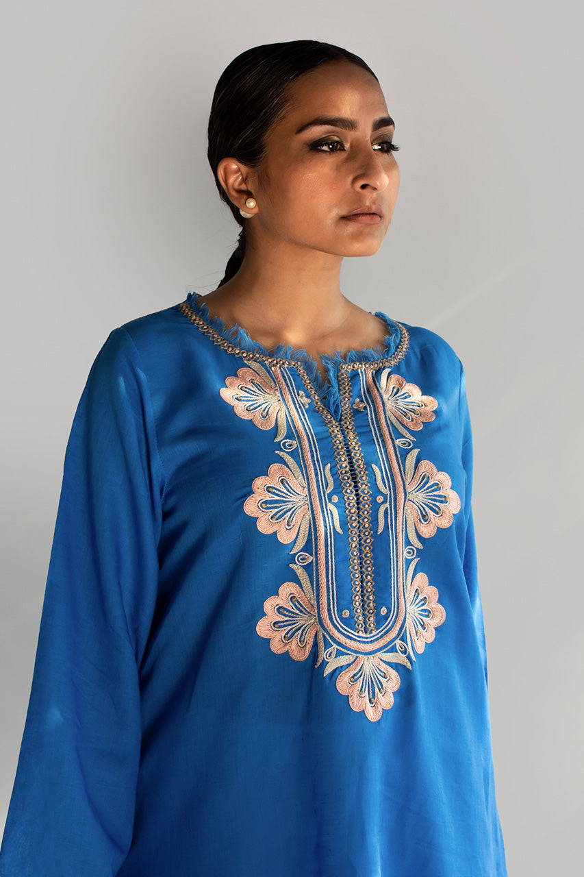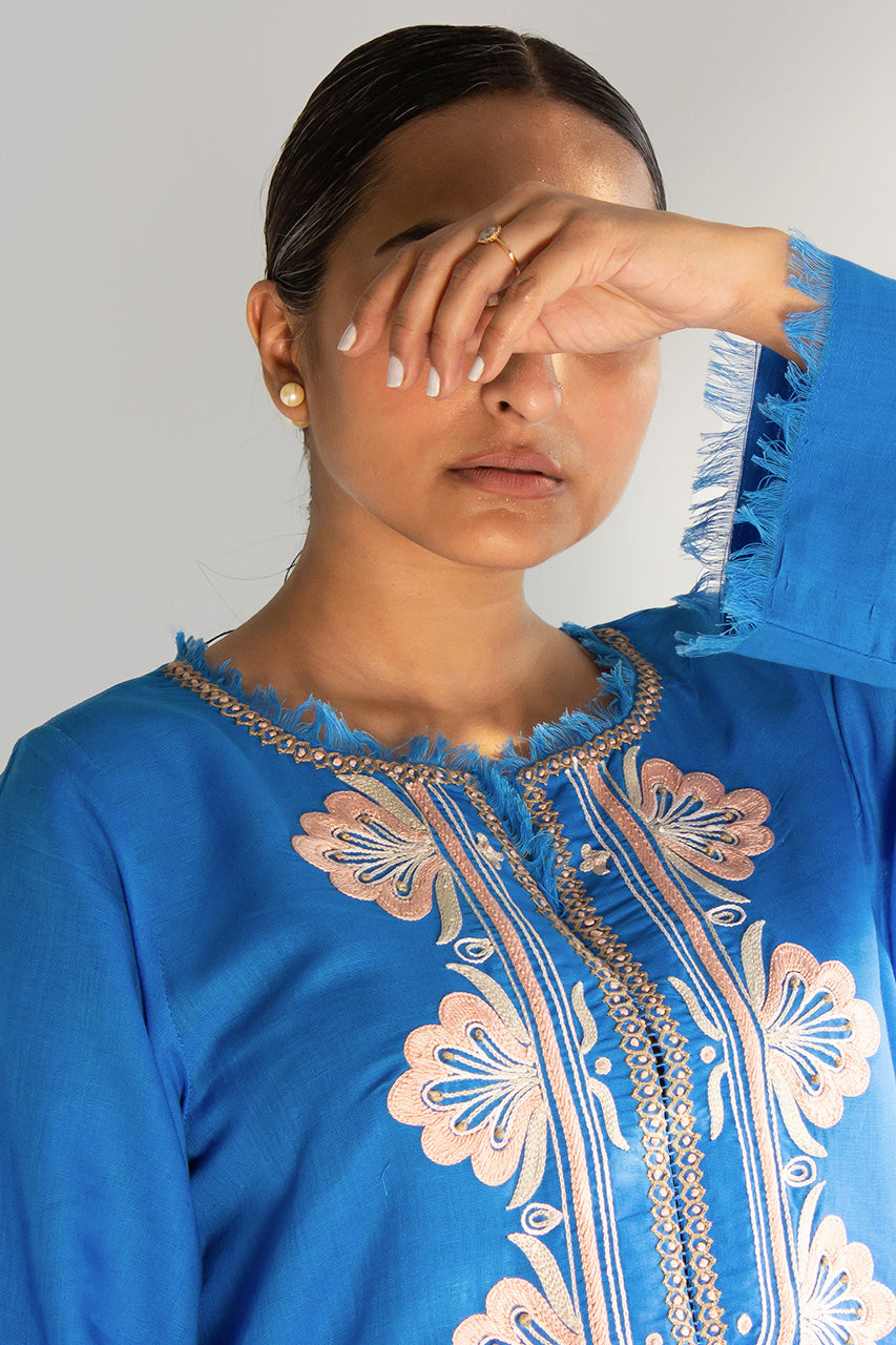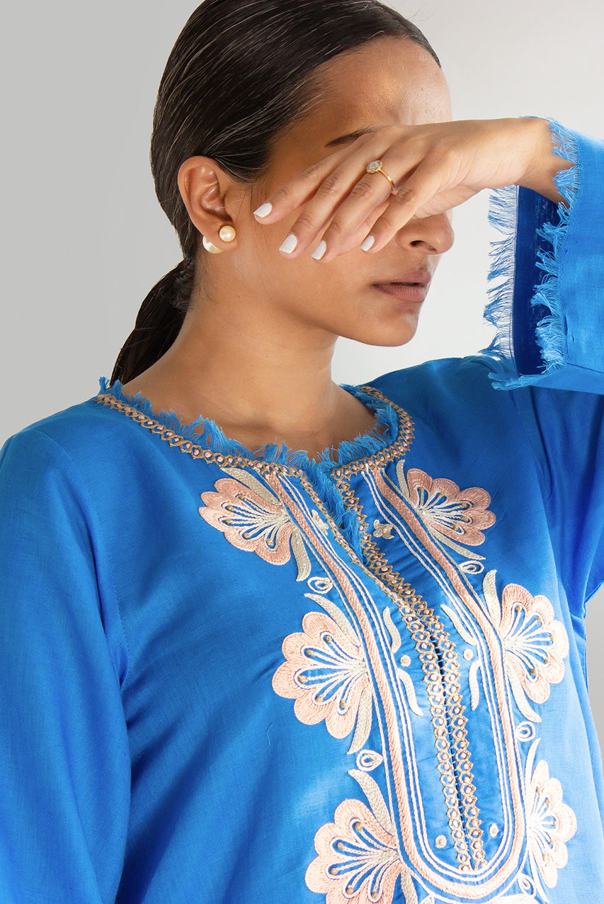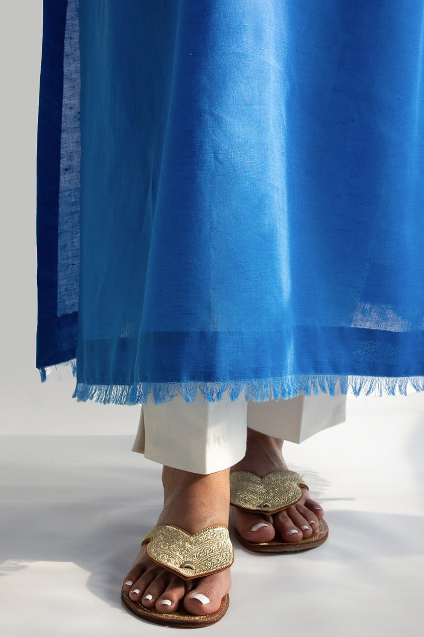 EVERYDAY ESSENTIALS - A meticulously crafted piece, the appliquéd and dori-worked kurta in Irish linen is a testament to artistry and sophistication. Fashioned from the exquisite Irish linen fabric, known for its breathability and luxurious texture, this kurta combines traditional techniques with contemporary design.