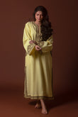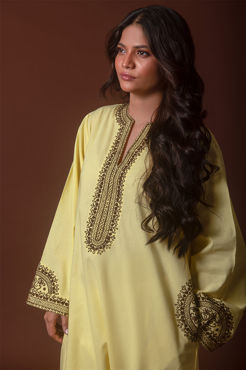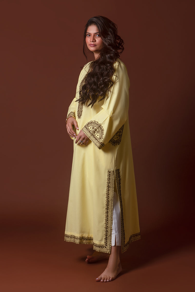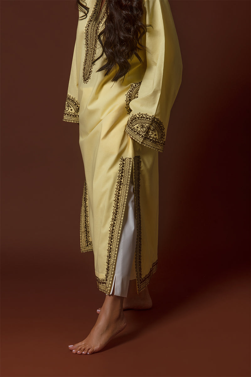 This elegant ensemble, made from Irish linen, embodies comfort and timeless sophistication. The vibrant yellow hue is enhanced with intricate embroidery in deep tones, running along the neckline, cuffs, and hemline, creating a beautiful contrast. The relaxed kaftan-inspired silhouette features flared sleeves and side slits, offering ease of movement while maintaining an air of refined grace. Perfect for daytime gatherings or festive occasions, this piece is a celebration of minimalism and elegance.