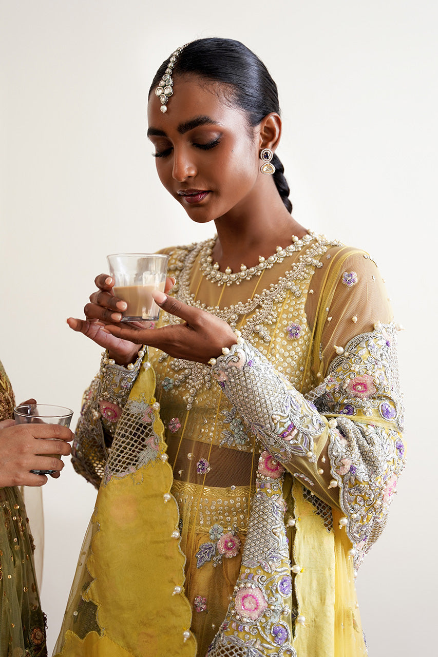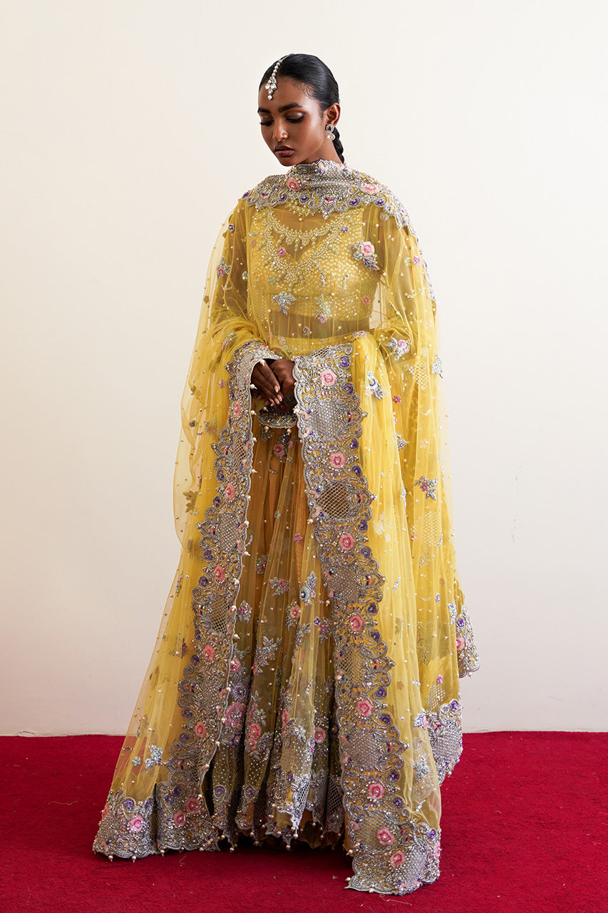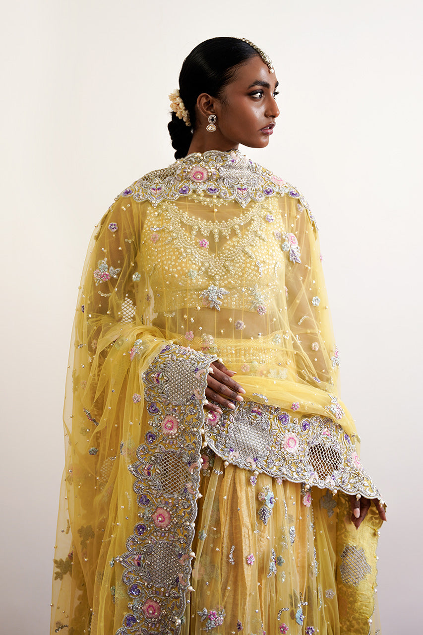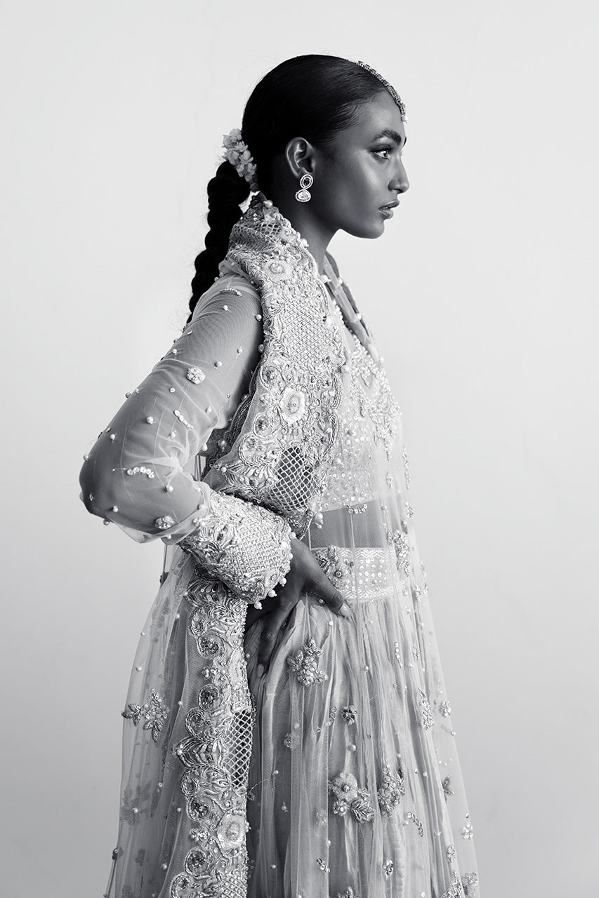 PAREEVASH is a meticulously crafted kaalidar fully decorated with silver and pearl embellished neckline, floral bunches and booti all over along with heavily embellished border. This beautiful shirt is layered with organza lamé lengha and sequence choli and a delicately embellished net dupatta with heavy borders