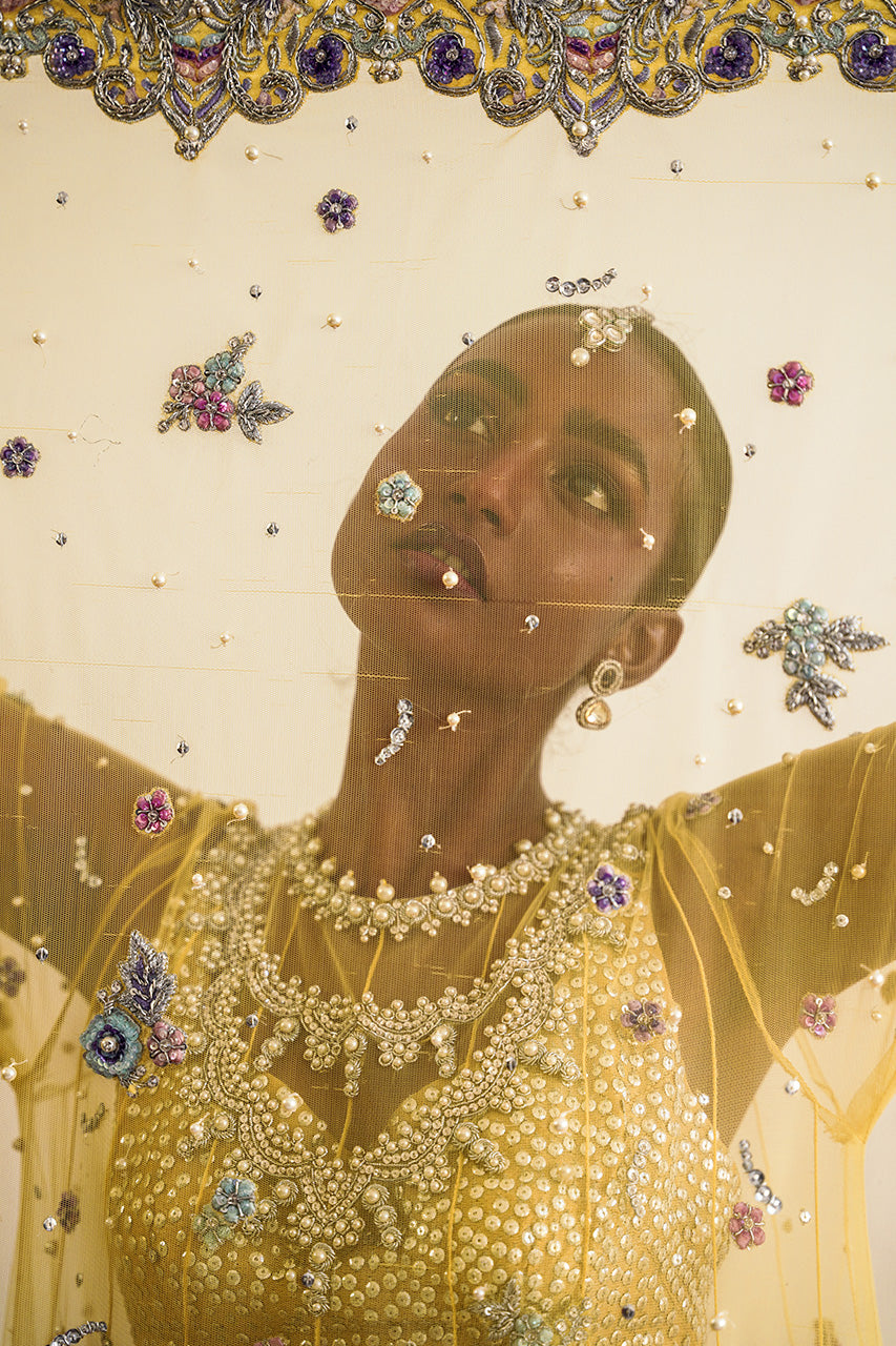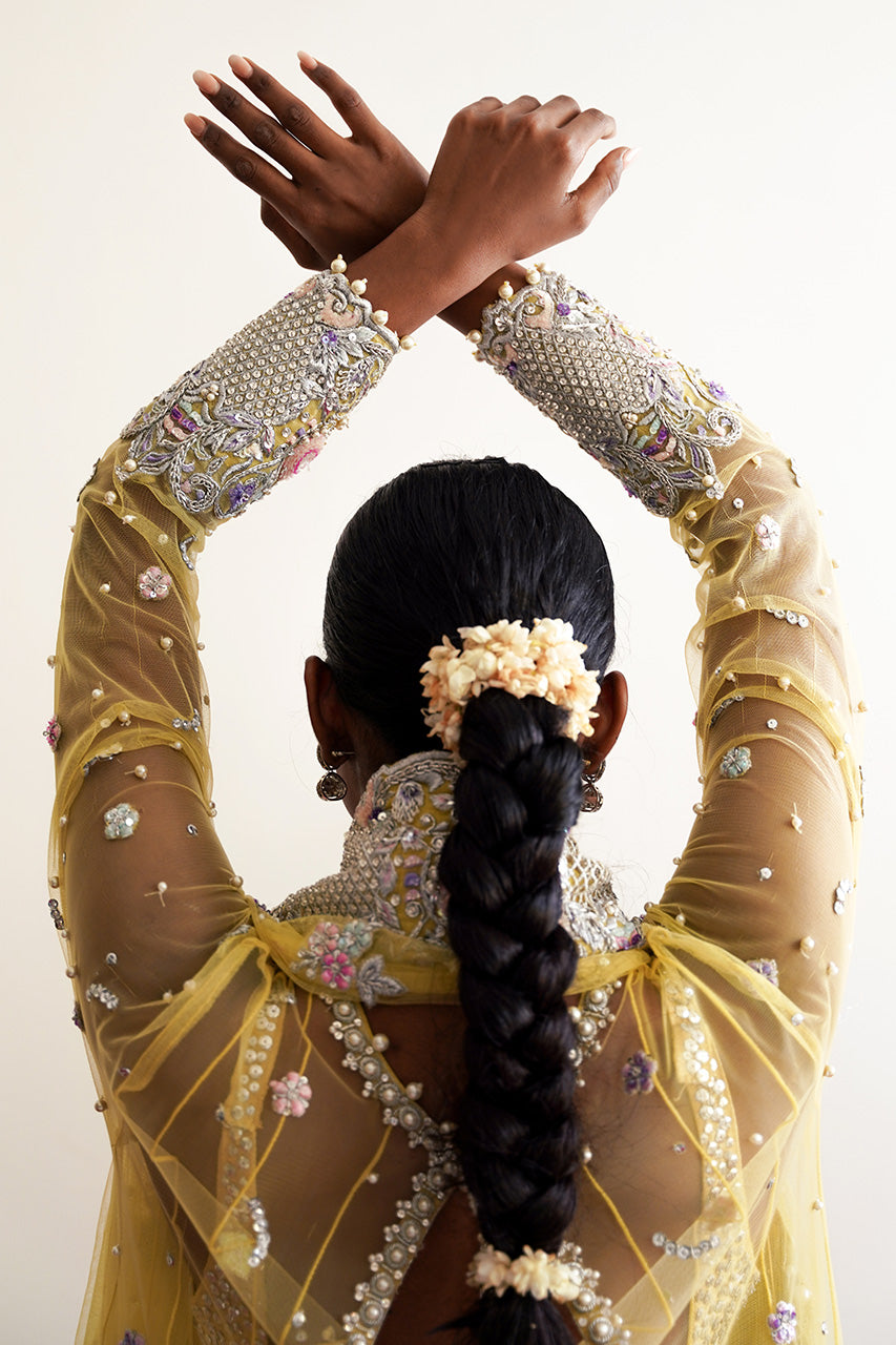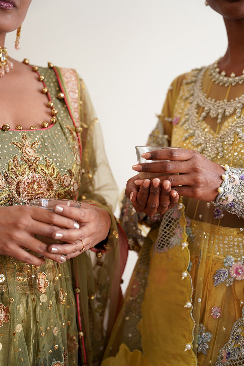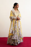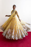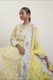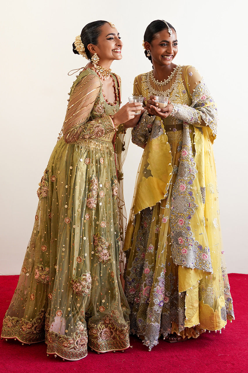 PAREEVASH is a meticulously crafted kaalidar fully decorated with silver and pearl embellished neckline, floral bunches and booti all over along with heavily embellished border. This beautiful shirt is layered with organza lamé lengha and sequence choli and a delicately embellished net dupatta with heavy borders