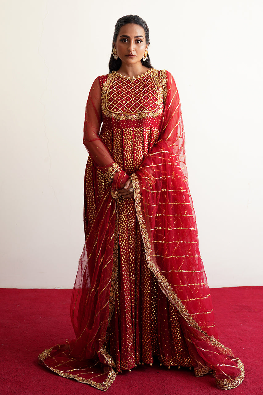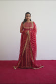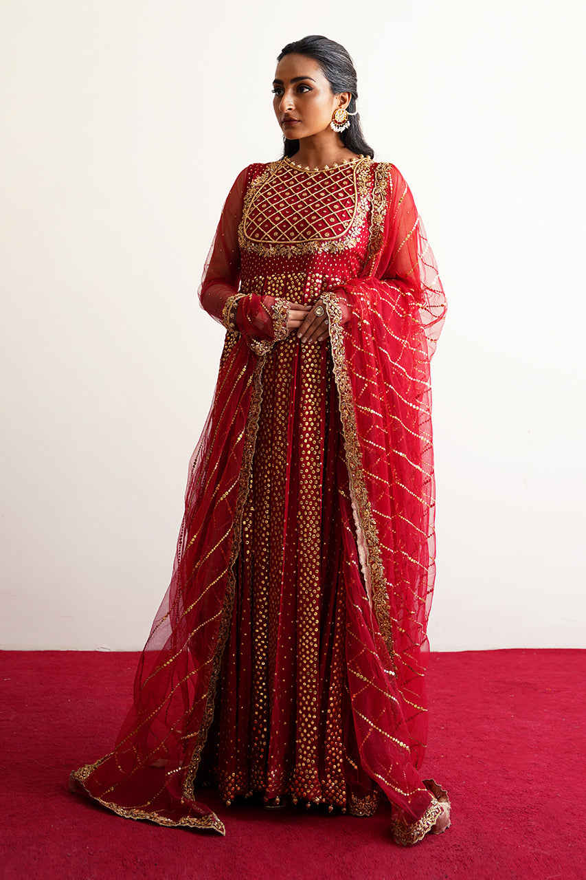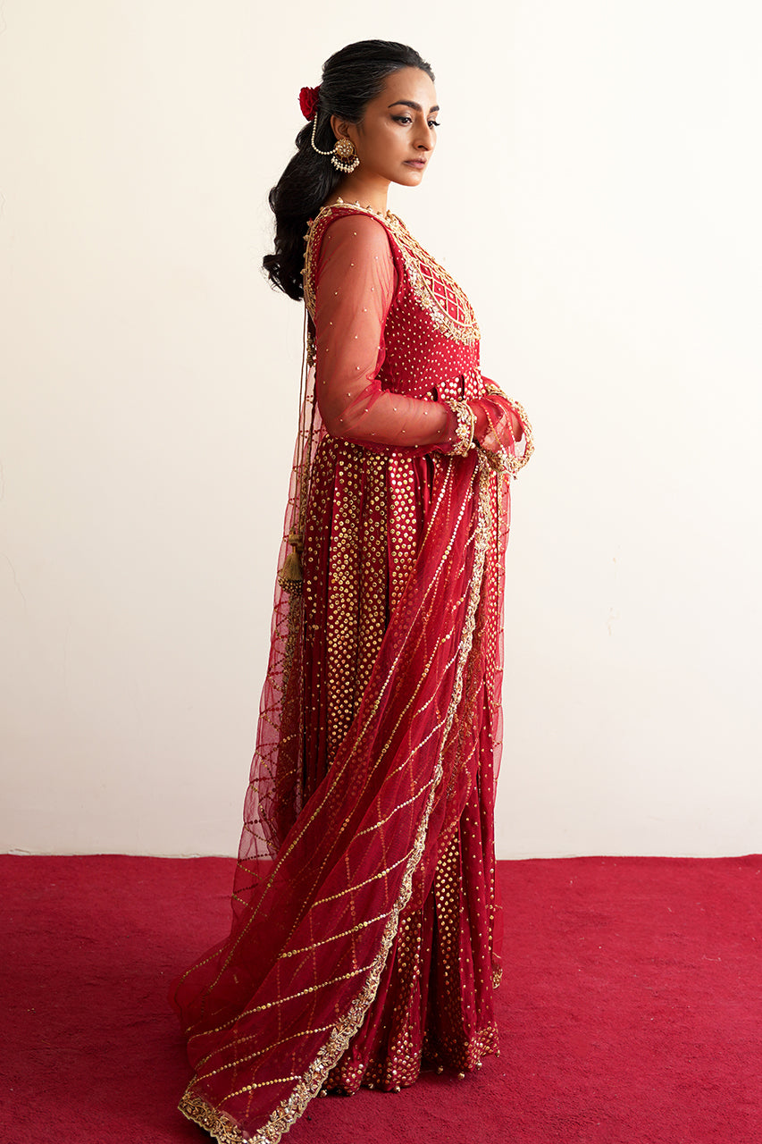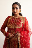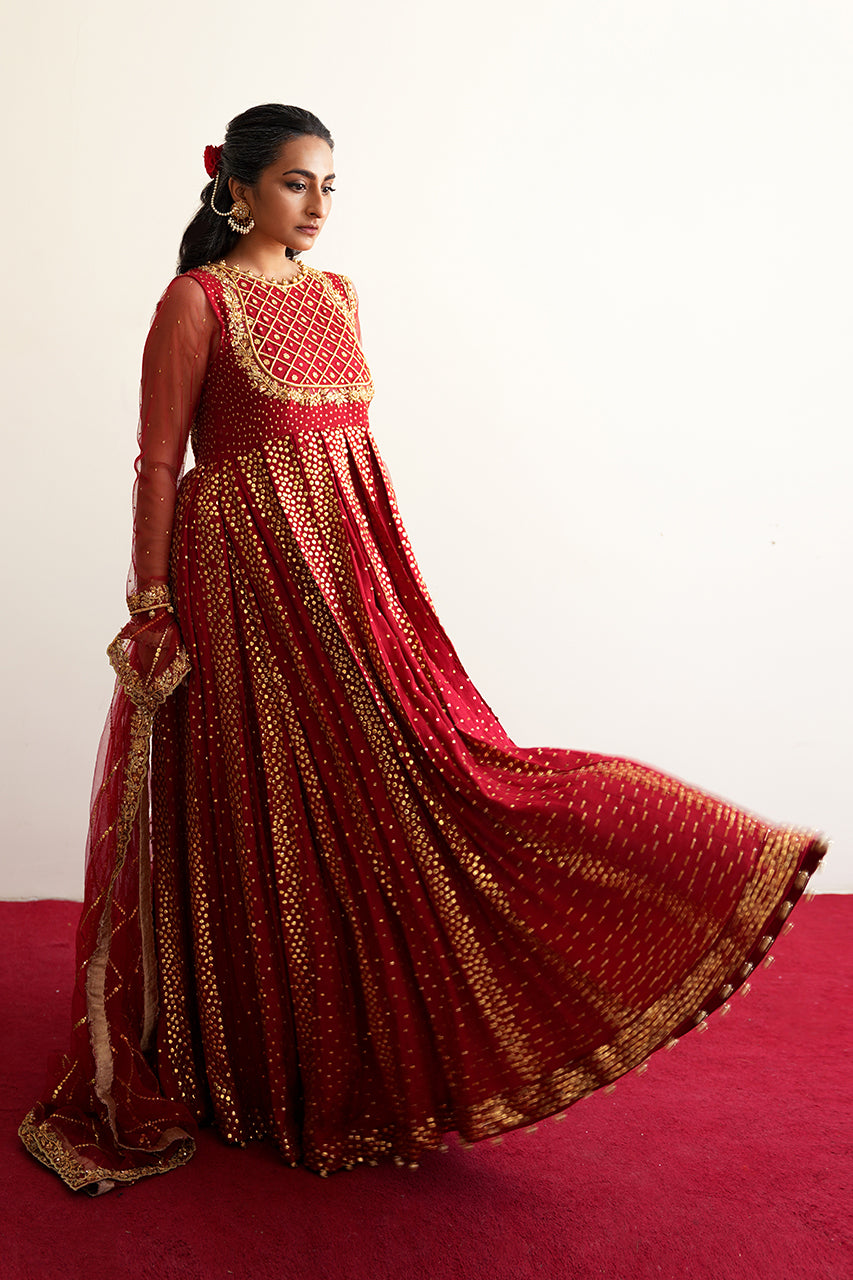 Envision a majestic kalidar angharkha, adorned with opulent hand embroidery and intricate Marori work. The garment exudes grandeur as the flowing silhouette of the kalidar adds a regal touch. The meticulous hand embroidery enhances the richness of the attire, creating a dazzling interplay of traditional craftsmanship and lavish embellishments. The marori embellishement work further elevates the grandeur, making this ensemble a stunning manifestation of cultural richness and sartorial splendor.