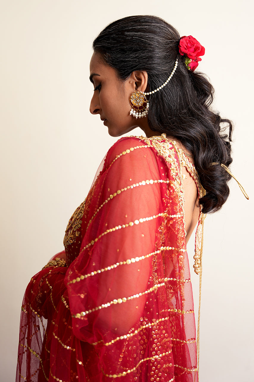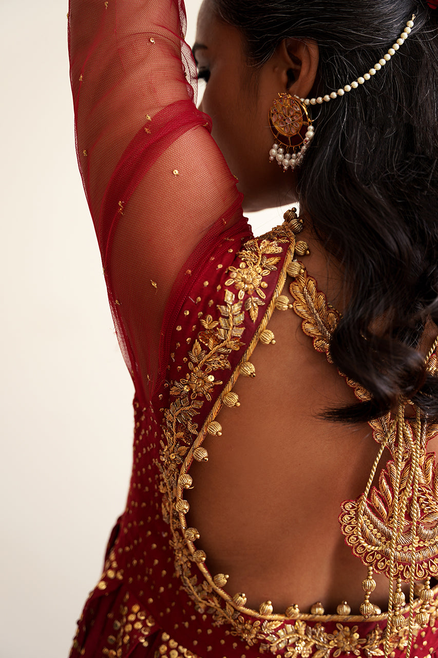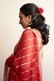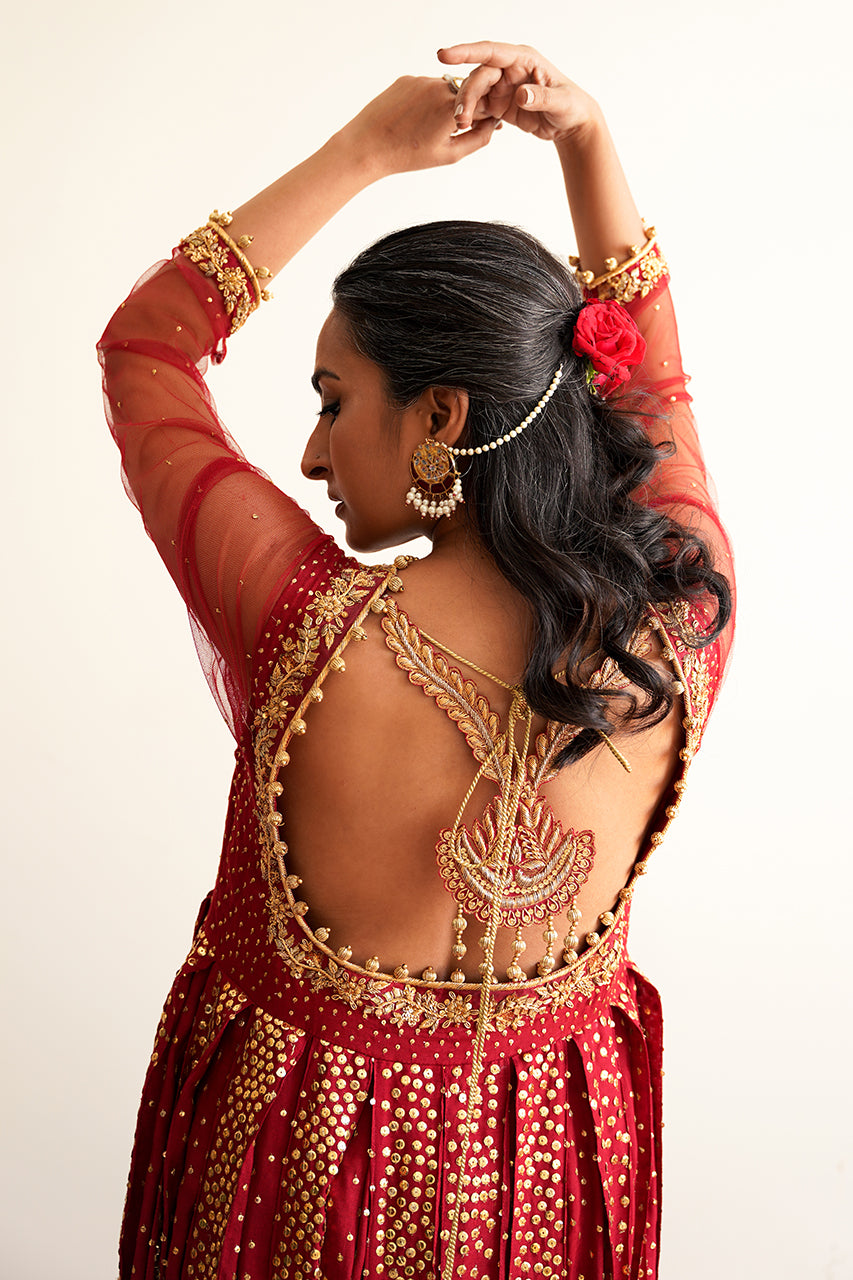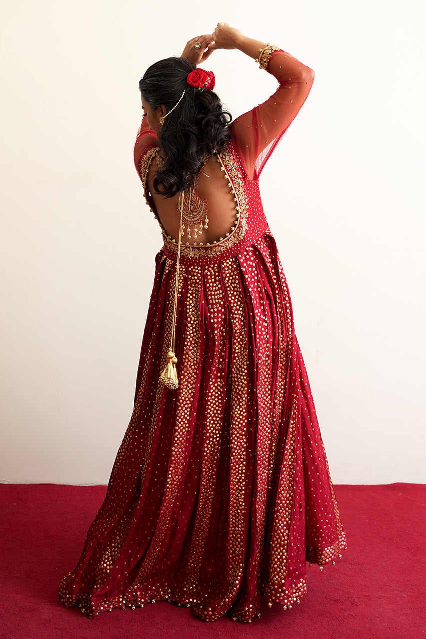 Envision a majestic kalidar angharkha, adorned with opulent hand embroidery and intricate Marori work. The garment exudes grandeur as the flowing silhouette of the kalidar adds a regal touch. The meticulous hand embroidery enhances the richness of the attire, creating a dazzling interplay of traditional craftsmanship and lavish embellishments. The marori embellishement work further elevates the grandeur, making this ensemble a stunning manifestation of cultural richness and sartorial splendor.