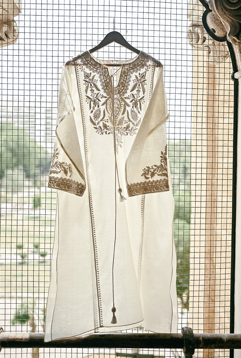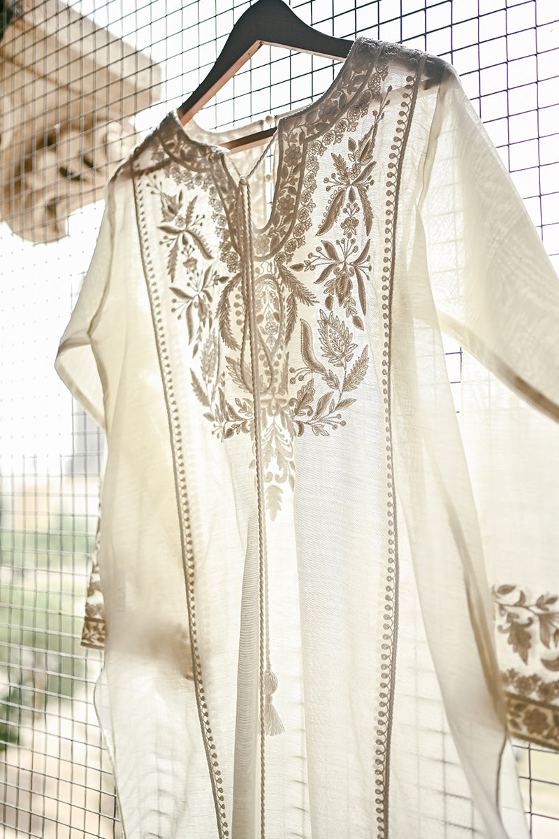 Crafted in fine paper cotton, SAALEHA embodies the elegance of heritage craftsmanship through a contemporary lens. The silhouette flows effortlessly with minimal tailoring and soft hand-finished detailing, evoking timeless grace. Its breathable texture and structured drape make it a versatile choice for both quiet daywear and understated evenings — a piece that honors tradition while embracing modern ease.