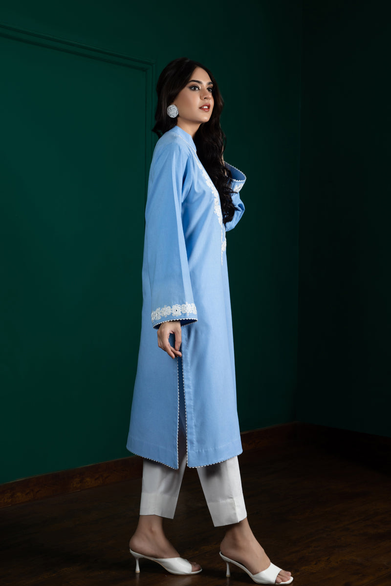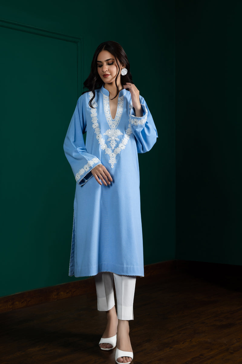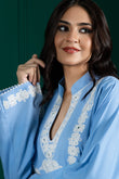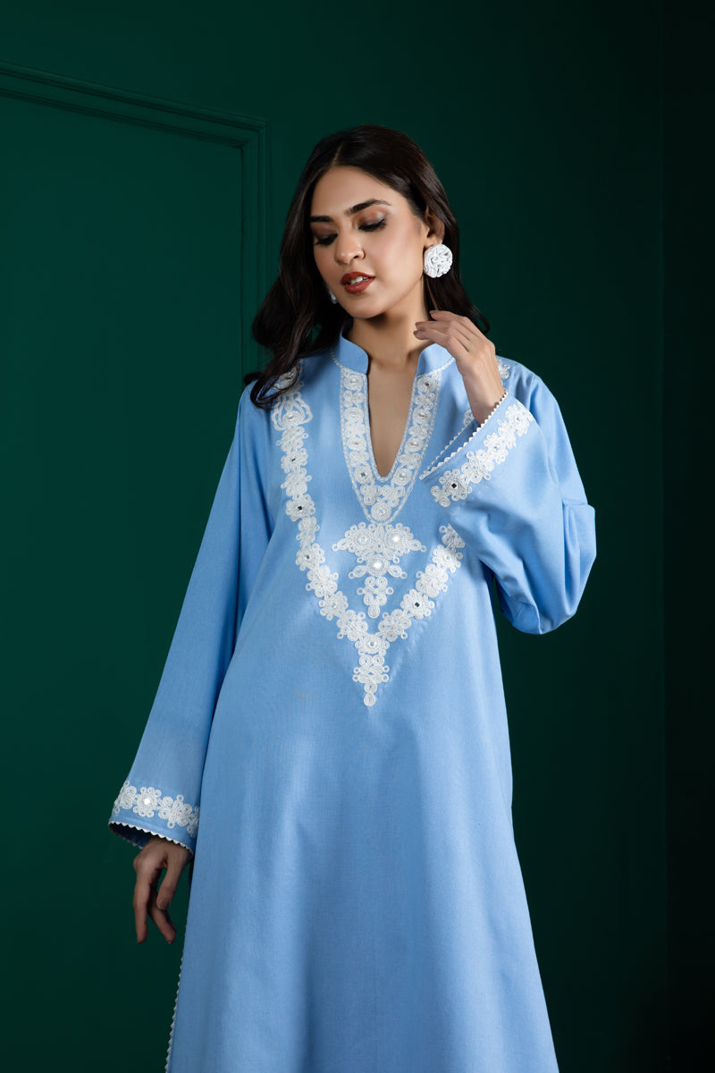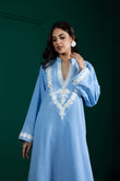 Shrnaz is a relaxed-cut sky blue Kurta, featuring one-toned Dori and mirrored embroidery.
