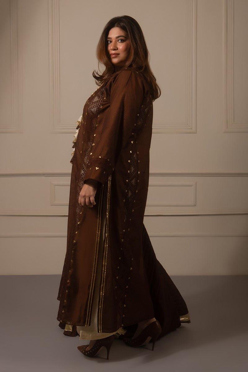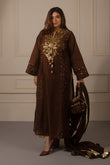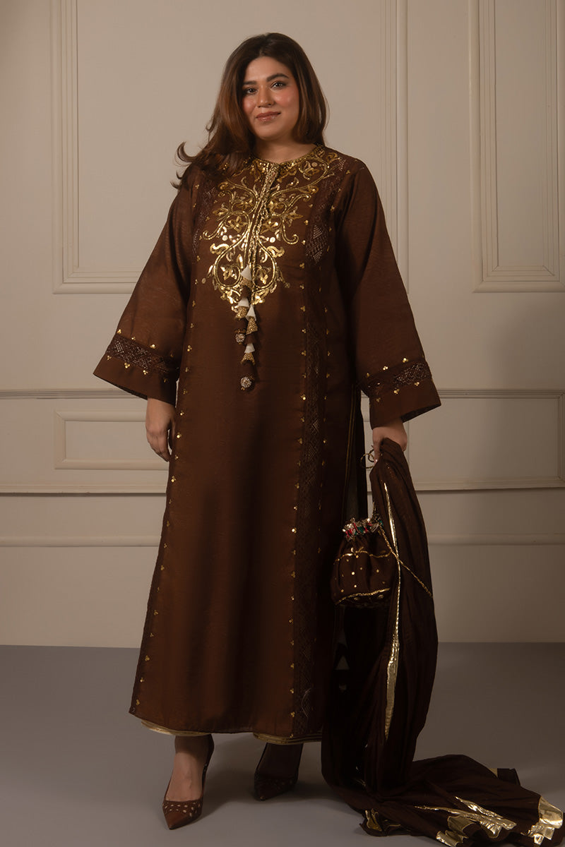 Draped in a rich, deep chocolate brown, Zarmeen is a tribute to regal sophistication. The silhouette is gracefully tailored with fine golden sequin embroidery that glistens subtly, creating a delicate contrast against the deep hue. Paired with an azaari shalwar and a sheer dupatta lined with metallic accents, this look captures the beauty of understated grandeur.