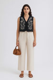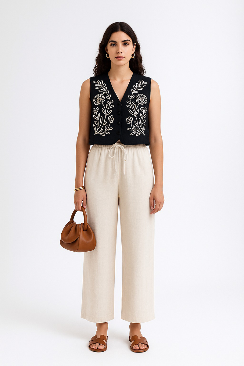 A timeless pairing of structure and softness. The Zehra waistcoat features intricate ivory dori embroidery on a jet-black base — a nod to artisanal storytelling. The wide-leg linen trousers, in a natural oat hue, offer effortless elegance with a drawstring waist and fluid drape.